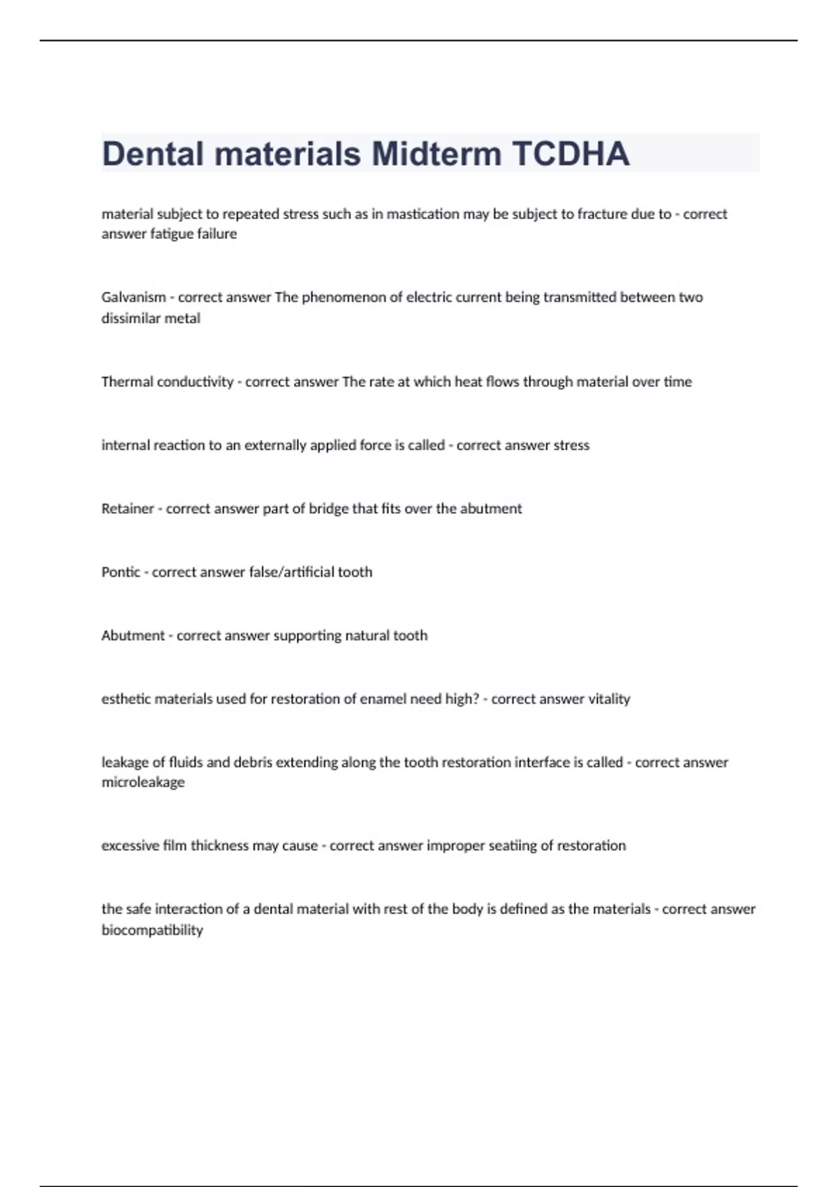 Dental materials Midterm TCDHA material subject to repeated stress such as in mastication may be subject to fracture due to - correct answer fatigue failure Galvanism - correct answer The phenomenon of electric current being transmitted between two dissimilar metal Thermal conductivity - correct answer The rate at which heat flows through material over time internal reaction to an externally applied force is called - correct answer stress Retainer - correct answer part of bridge that fits over the abutment Pontic - correct answer false/artificial tooth Abutment - correct answer supporting natural tooth esthetic materials used for restoration of enamel need high? - correct answer vitality leakage of fluids and debris extending along the tooth restoration interface is called - correct answer microleakage excessive film thickness may cause - correct answer improper seatiing of restoration the safe interaction of a dental material with rest of the body is defined as the materials - correct answer biocompatibility which of the following restorative materials is most likely to fracture under compressive stress? - correct answer porcelain most soluble restorative material - correct answer glass ionomer crossosion is of the greatest concern for which restorative material - correct answer amalgam surface discoloration of a metal restoration is called - correct answer tarnish restorative materials with values of thermal conductivity similar to enamel include - correct answer composite resin defining characteristic of a solid is that it has - correct answer shape and volume most stable primary bonds - correct answer have regular crystalline structures correct term for describing the macimal amount of stress a material can withstand without breaking is - correct answer ultimate strength when the weight of a material increases in relationship to its volume, this is described as - correct answer dense hardness determines the materials ability to - correct answer penetrate an object when deformation is not permanent and a material recovers it has good - correct answer elasticity resistance to flow is known as - correct answer viscosity thixotropic materials are those that - correct answer flow under mechanical forces