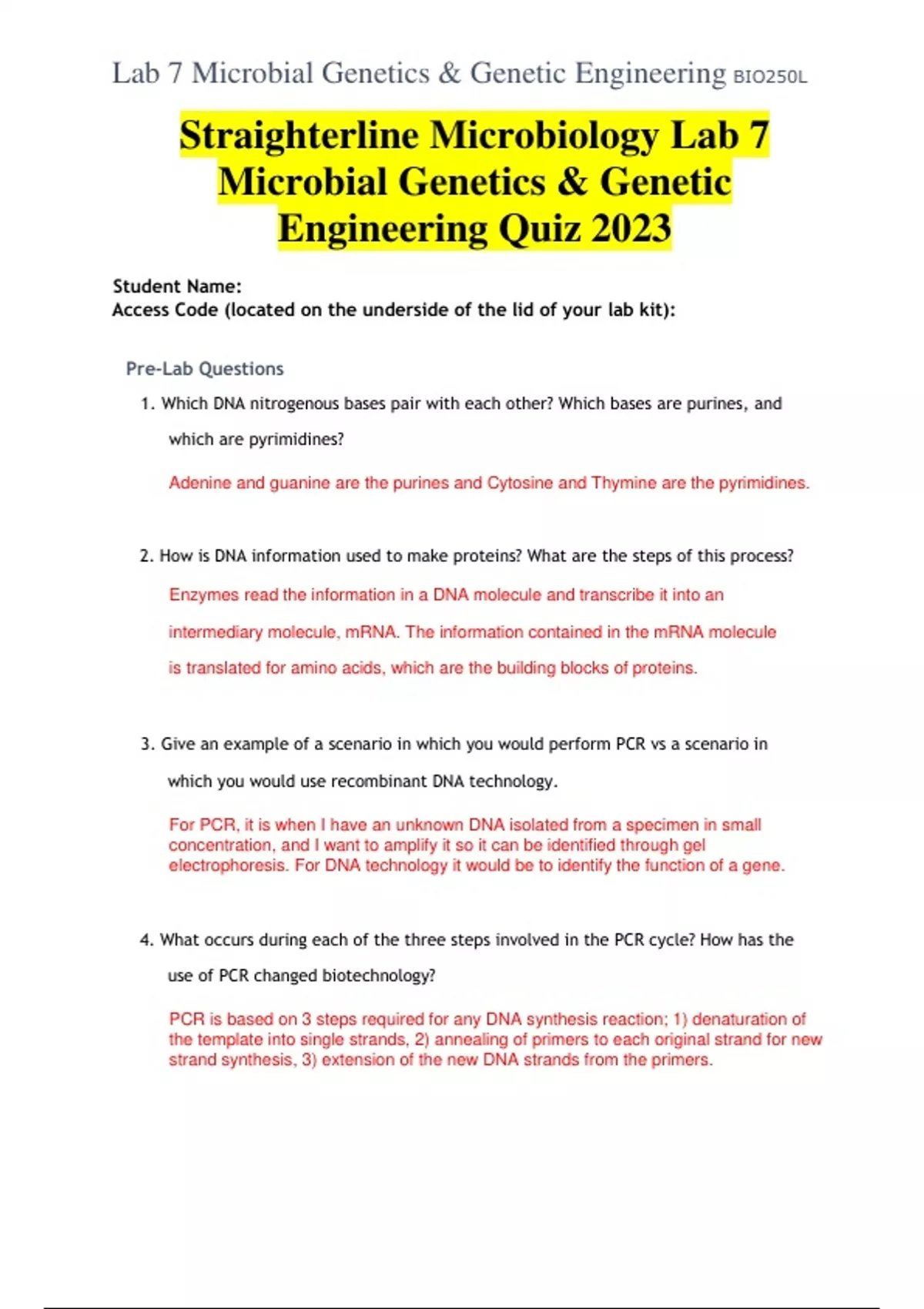 Straighterline Microbiology Lab 7 Microbial Genetics & Genetic Engineering Quiz 2023