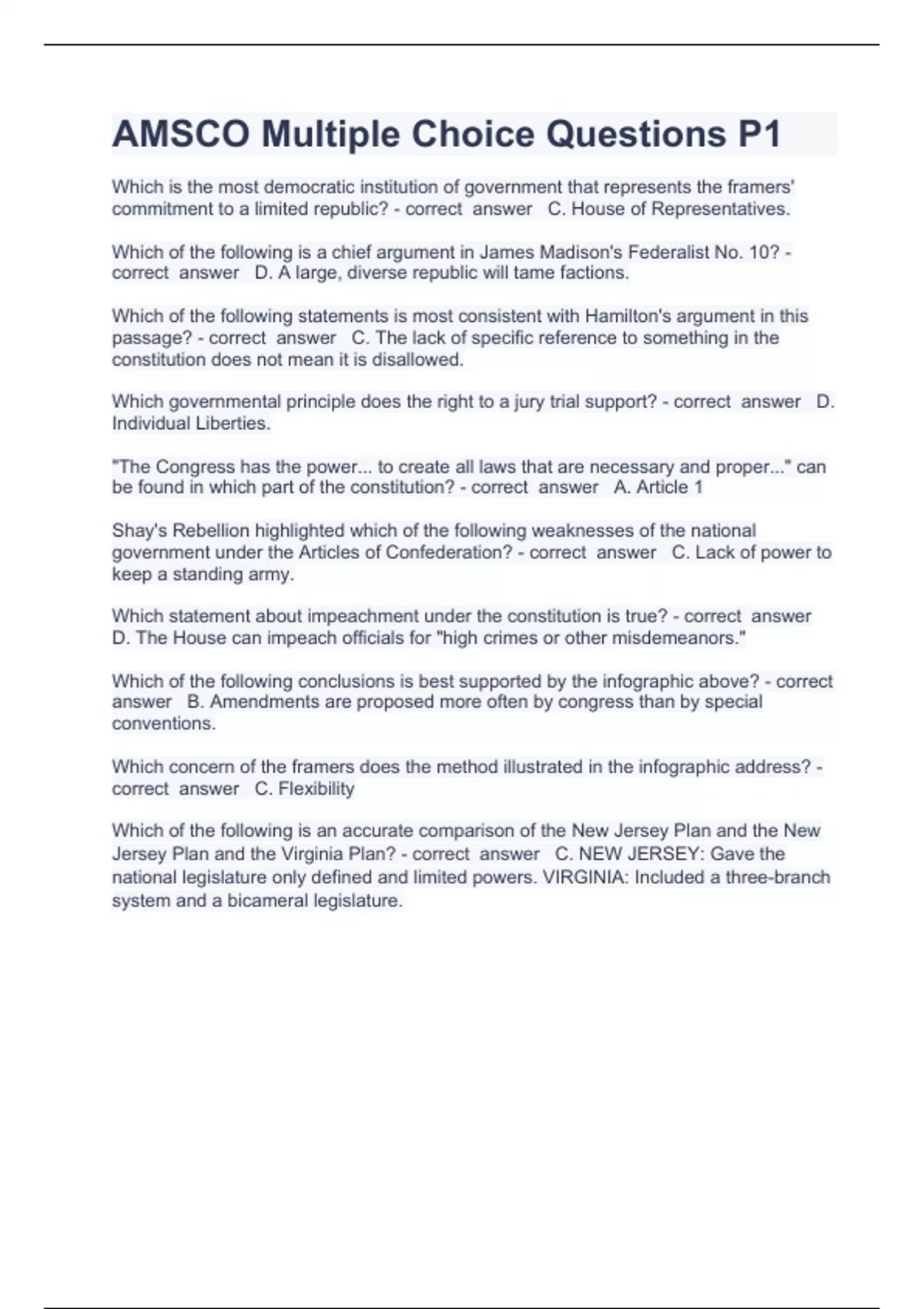 AMSCO Multiple Choice Questions P1 Question and answers already passed 2023/2024Which is the most democratic institution of government that represents the framers' commitment to a limited republic? - correct answer C. House of Representatives. Which of the following is a chief argument in James Madison's Federalist No. 10? - correct answer D. A large, diverse republic will tame factions. Which of the following statements is most consistent with Hamilton's argument in this passage? - correct answer C. The lack of specific reference to something in the constitution does not mean it is disallowed.