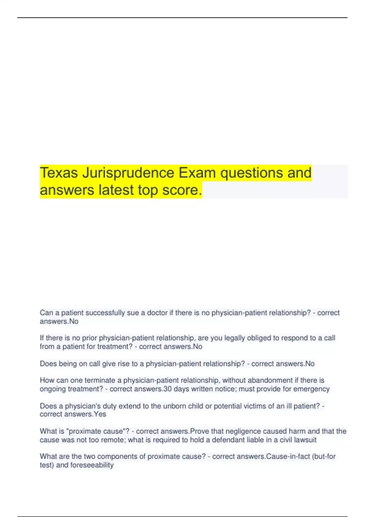 Texas Jurisprudence Exam questions and answers latest top score. Can a patient successfully sue a doctor if there is no physician-patient relationship? - correct answers.No If there is no prior physician-patient relationship, are you legally obliged to respond to a call from a patient for treatment? - correct answers.No Does being on call give rise to a physician-patient relationship? - correct answers.No How can one terminate a physician-patient relationship, without abandonment if there is ongoing treatment? - correct answers.30 days written notice; must provide for emergency Does a physician's duty extend to the unborn child or potential victims of an ill patient? - correct answers.Yes What is "proximate cause"? - correct answers.Prove that negligence caused harm and that the cause was not too remote; what is required to hold a defendant liable in a civil lawsuit What are the two components of proximate cause? - correct answers.Cause-in-fact (but-for test) and foreseeability Does an expert witness have to be actively practicing medicine? - correct answers.Yes Does an expert witness have to know standards of care? - correct answers.Yes Does an expert witness have to have enough training to express an opinion on whether standard of care was provided? - correct answers.Yes Does an expert witness have to be board certified? - correct answers.No, board certified or eqivalent In a medical malpractice case, are expert witnesses required? - correct answers.Yes, with two exceptions In a medical malpractice setting, what 2 instances do not need expert testimony? - correct answers.Res ipsa loquitur (e.g., amputation of wrong leg) and negligence per se (a law was broken) What are "exemplary damages"? - correct answers.Damages above compensatory designed to punish the defendant and deter the behavior Is there a cap to noneconomic damages? How much? - correct answers.$250,000 for physicians, $500,000 for hospitals Does the cap on noneconomic damage depend on the number of defendants or claimants? - correct answers.No What is "proportional responsibility"? - correct answers.Percentage of liability apportioned according to percentage of fault Can the claimant have part of the proportional responsibility? - correct answers.Yes If the claimant's proportionate responsibility is more than what %, he/she may not recover damages? - correct answers.If > 50%, no damages awarded How long is the statute of limitations for adults? For minors? - correct answers.2 years; for minors 2 years after becoming 18 years of age By how much can the statute of limitations be extended and how? - correct answers.File complaint—extra 60-day, notice letter extends statute by 75 days What is the statute of limitations for wrongful death? - correct answers.2 years What is the discovery rule? Give examples. - correct answers.Statute does not begin until damage is discovered. For example, a retained sponge that is found 3 years post-op Is there immunity from civil action in emergency cases? - correct answers.Yes, except gross negligence Is there immunity from civil action in volunteer care? - correct answers.Yes, except gross negligence When can a physician be charged with "assault and battery"? - correct answers.Un-consented surgery or examination or when exceeding the scope of the consent When can a physician be charged with patient abandonment? - correct answers.Unilateral cessation of treatment when continued treatment is necessary What is "strict liability"? - correct answers.Liability that does not depend on actual negligence, but that is based on a breach of a duty to make something safe. This often applies to product liability Are hospitals liable for the actions of a physician? - correct answers.No, unless the hospital employs the physician Who determines in a criminal case if the medical records of a patient should be released? - correct answers.Judge by inspection How many days do you have to release medical records to an attorney? - correct answers.45 days Can medical records be admitted as evidence in court? What are the requirements? - correct answers.Yes, but only with affidavit What are schedule 1, 2, 3, 4, 5 drugs? - correct answers.Schedule 1—no known use (e.g., heroin); schedule 2—very addictive (morphine, cocaine); schedule 3-5—less addictive What are dangerous drugs? - correct answers.Prescription drugs other than schedule 1-5 How many DEA registrations do you need if you prescribe drugs? dispense drugs? - correct answers.One to prescribe; a separate registration for each location where you dispense How often do you renew your DEA license? - correct answers.Every 3 years Can you move your office location and then change your DEA? - correct answers.No, need to change BEFORE move Is a DEA registration sufficient to prescribe drugs in Texas? - correct answers.No, also need Department of Public Safety Bureau of Narcotics and Dangerous Drug registration How often do you renew a DPS license? - correct answers.Yearly Do you have to display the DEA and DPS licenses? - correct answers.Not required by any statute. How many days do you have to notify the DPS of any change in your information (name, address, tel., etc.)? - correct answers.7 days Can you have your DPS suspended and keep your DEA or vice versa? - correct answers.No, they are interconnected For schedules 2-5 drugs, can you just put the number of pills on prescription? - correct answers.No, number and number spelled out Do you have to put intended use on prescription? - correct answers.Yes With how many days of a schedule 2-5 drug can a patient be discharged from the hospital? - correct answers.7 days; only if the drug was already rx in the hospital