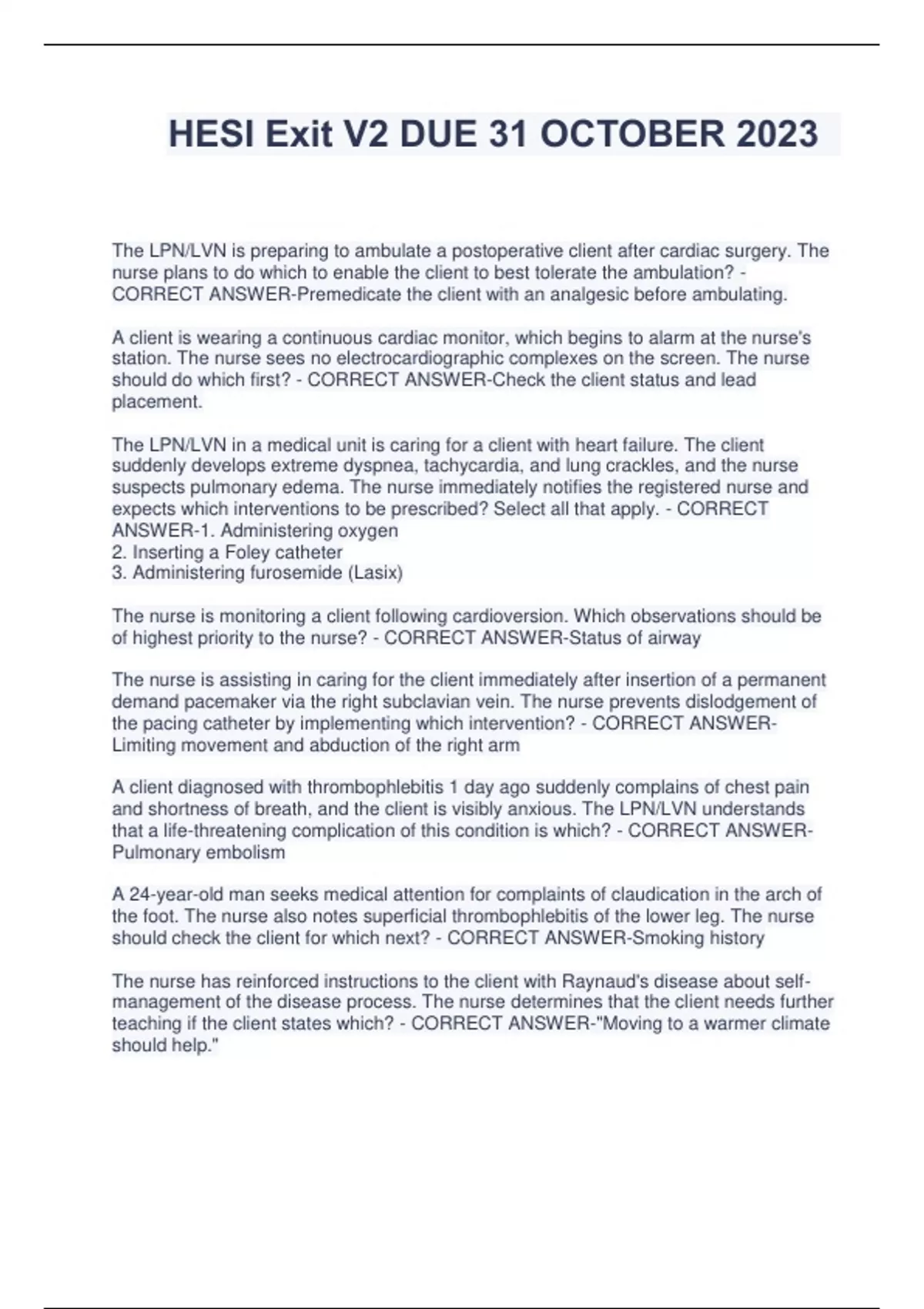 HESI Exit V2 DUE 31 OCTOBER 2023 The LPN/LVN is preparing to ambulate a postoperative client after cardiac surgery. The nurse plans to do which to enable the client to best tolerate the ambulation? - CORRECT ANSWER-Premedicate the client with an analgesic before ambulating. A client is wearing a continuous cardiac monitor, which begins to alarm at the nurse's station. The nurse sees no electrocardiographic complexes on the screen. The nurse should do which first? - CORRECT ANSWER-Check the client status and lead placement. The LPN/LVN in a medical unit is caring for a client with heart failure. The client suddenly develops extreme dyspnea, tachycardia, and lung crackles, and the nurse suspects pulmonary edema. The nurse immediately notifies the registered nurse and expects which interventions to be prescribed? Select all that apply. - CORRECT ANSWER-1. Administering oxygen 2. Inserting a Foley catheter 3. Administering furosemide (Lasix) The nurse is monitoring a client following cardioversion. Which observations should be of highest priority to the nurse? - CORRECT ANSWER-Status of airway The nurse is assisting in caring for the client immediately after insertion of a permanent demand pacemaker via the right subclavian vein. The nurse prevents dislodgement of the pacing catheter by implementing which intervention? - CORRECT ANSWERLimiting movement and abduction of the right arm A client diagnosed with thrombophlebitis 1 day ago suddenly complains of chest pain and shortness of breath, and the client is visibly anxious. The LPN/LVN understands that a life-threatening complication of this condition is which? - CORRECT ANSWERPulmonary embolism A 24-year-old man seeks medical attention for complaints of claudication in the arch of the foot. The nurse also notes superficial thrombophlebitis of the lower leg. The nurse should check the client for which next? - CORRECT ANSWER-Smoking history The nurse has reinforced instructions to the client with Raynaud's disease about selfmanagement of the disease process. The nurse determines that the client needs further teaching if the client states which? - CORRECT ANSWER-"Moving to a warmer climate should help." A client with myocardial infarction suddenly becomes tachycardic, shows signs of air hunger, and begins coughing frothy, pink-tinged sputum. The nurse listens to breath sounds, expecting to hear which breath sounds bilaterally? - CORRECT ANSWERCrackles The LPN/LVN is collecting data on a client with a diagnosis of rightsided heart failure. The nurse should expect to note which specific characteristic of this condition? - CORRECT ANSWER-Dependent edema The LPN/LVN is checking the neurovascular status of a client who returned to the surgical nursing unit 4 hours ago after undergoing an aortoiliac bypass graft. The affected leg is warm, and the nurse notes redness and edema. The pedal pulse is palpable and unchanged from admission. The nurse interprets that the neurovascular status is which? - CORRECT ANSWER-Normal, caused by increased blood flow through the leg A client with a diagnosis of rapid rate atrial fibrillation asks the nurse why the health care provider is going to perform carotid massage. The LPN/LVN responds that this procedure may stimulate which? - CORRECT ANSWER-Vagus nerve to slow the heart rate A client is admitted to the hospital with possible rheumatic endocarditis. The LPN/LVN should check for a history of which type of infection? - CORRECT ANSWERStaphylococcal infection client has an Unna boot applied for treatment of a venous stasis leg ulcer. The LPN/LVN notes that the client's toes are mottled, and cool and the client verbalizes some numbness and tingling of the foot. Which interpretation should the nurse make of these findings? - CORRECT ANSWER-The boot has been applied too tightly A client with angina complains that the anginal pain is prolonged and severe and occurs at the same time each day, most often in the morning. On further data collection, the nurse notes that the pain occurs in the absence of precipitating factors. How should the LPN/LVN best describe this type of anginal pain? - CORRECT ANSWER-Variant angina The LPN/LVN is monitoring a client with an abdominal aortic aneurysm (AAA). Which finding is probably unrelated to the AAA? - CORRECT ANSWER-Hyperactive bowel sounds in the area An emergency department client who complains of slightly improved but unrelieved chest pain for 2 days is reluctant to take a nitroglycerin sublingual tablet offered by the nurse. The client states, "I don't need that—my dad takes that for his heart. There's nothing wrong with my heart." Which description best describes the client's response? - CORRECT ANSWER-Denial A client is scheduled for a cardiac catheterization using a radiopaque dye. The LPN/LVN checks which most critical item before the procedure? - CORRECT ANSWER-Prior reaction to contrast media A client is scheduled for a dipyridamole thallium scan. The LPN/ LVN should check to make sure that the client has not consumed which substance before the procedure? - CORRECT ANSWER-Caffeine An ambulatory clinic nurse is interviewing a client who is complaining of flulike symptoms. The client suddenly develops chest pain. Which question best assists the nurse to discriminate pain caused by a non cardiac problem? - CORRECT ANSWER- "Does the pain get worse when you breathe in?" A client with myocardial infarction (MI) has been transferred from the coronary care unit (CCU) to the general medical unit with cardiac monitoring via telemetry. The nurse assisting in caring for the client expects to note which type of activity prescribed? - CORRECT ANSWER-Bathroom privileges and self-care activities The LPN/LVN is preparing to care for a client who will be arriving from the recovery room after an above-the-knee amputation. The nurse ensures that which priority item is available for emergency use? - CORRECT ANSWER-Surgical tourniquet A client is diagnosed with thrombophlebitis. The nurse s