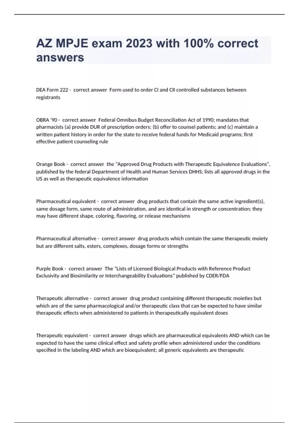 DEA Form 222 - correct answer Form used to order CI and CII controlled substances between registrants OBRA '90 - correct answer Federal Omnibus Budget Reconciliation Act of 1990; mandates that pharmacists (a) provide DUR of prescription orders; (b) offer to counsel patients; and (c) maintain a written patient history in order for the state to receive federal funds for Medicaid programs; first effective patient counseling rule Orange Book - correct answer the "Approved Drug Products with Therapeutic Equivalence Evaluations", published by the federal Department of Health and Human Services DHHS; lists all approved drugs in the US as well as therapeutic equivalence information Pharmaceutical equivalent - correct answer drug products that contain the same active ingredient(s), same dosage form, same route of administration, and are identical in strength or concentration; they may have different shape, coloring, flavoring, or release mechanisms Pharmaceutical alternative - correct answer drug products which contain the same therapeutic moiety but are different salts, esters, complexes, dosage forms or strengths Purple Book - correct answer The "Lists of Licensed Biological Products with Reference Product Exclusivity and Biosimilarity or Interchangeability Evaluations" published by CDER/FDA Therapeutic alternative - correct answer drug product containing different therapeutic moieties but which are of the same pharmacological and/or therapeutic class that can be expected to have similar therapeutic effects when administered to patients in therapeutically equivalent doses Therapeutic equivalent - correct answer drugs which are pharmaceutical equivalents AND which can be expected to have the same clinical effect and safety profile when administered under the conditions specified in the labeling AND which are bioequivalent; all generic equivalents are therapeutic equivalents; when used by the FDA, therapeutic equivalent does not mean different therapeutic moieties used for the same condition