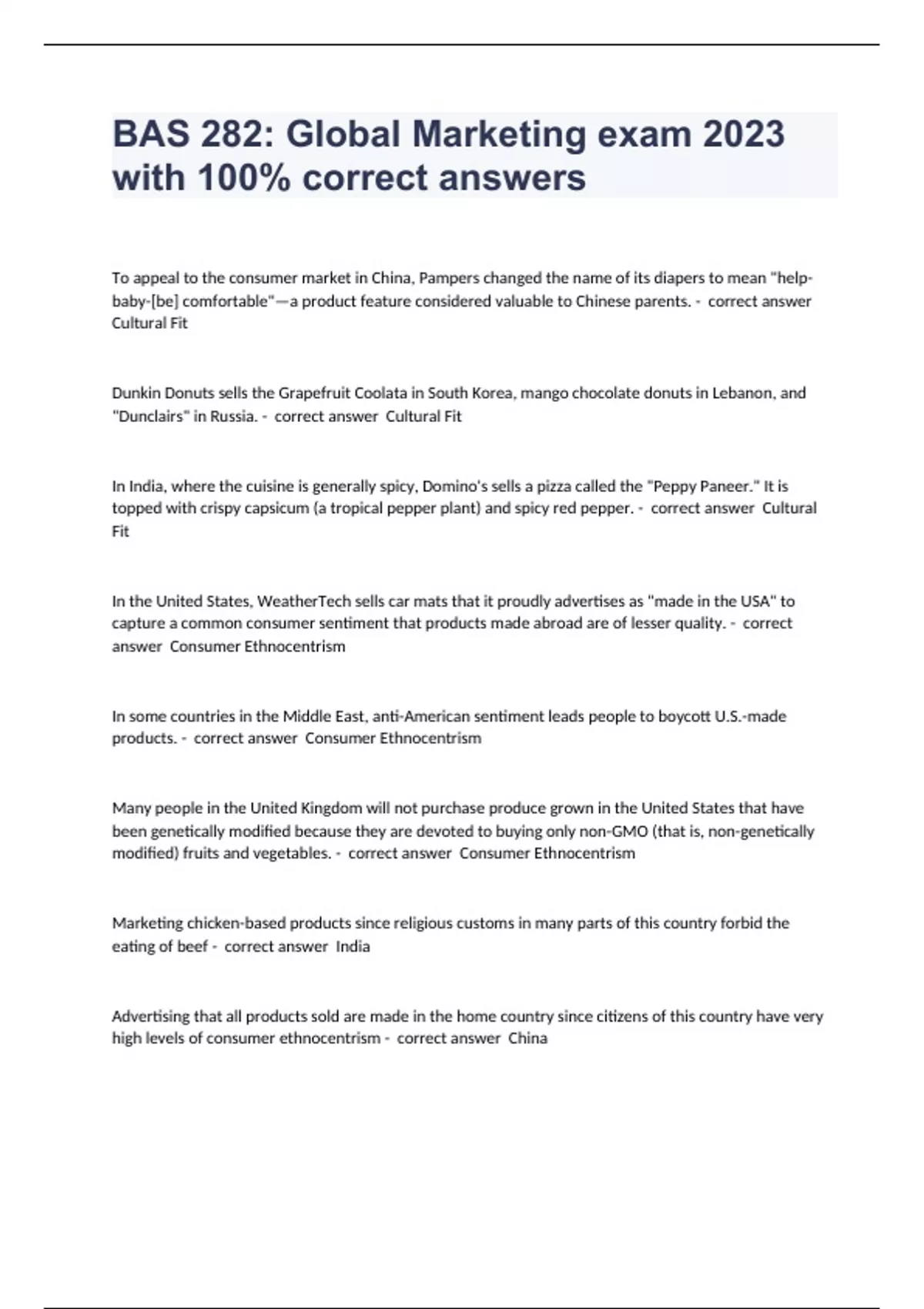 BAS 282: Global Marketing exam 2023 with 100% correct answers