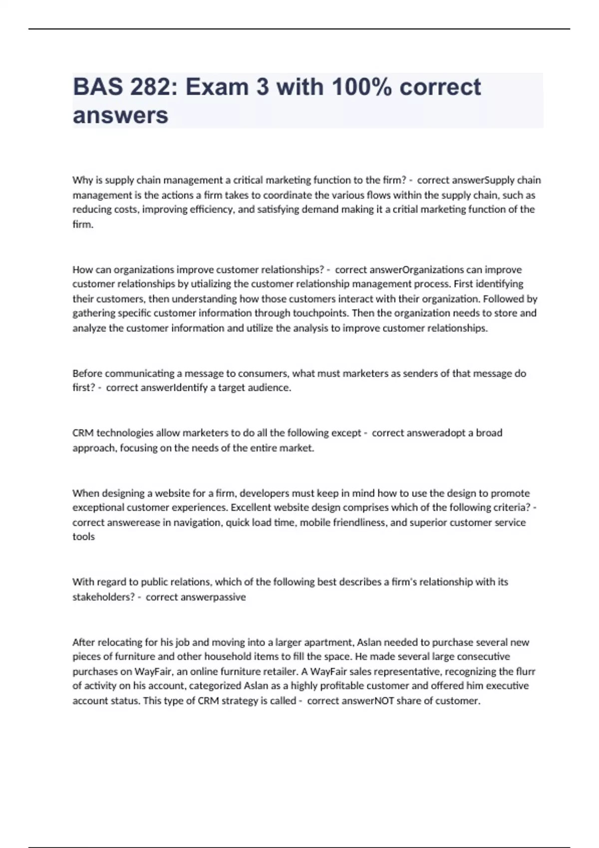 Why is supply chain management a critical marketing function to the firm? - correct answerSupply chain management is the actions a firm takes to coordinate the various flows within the supply chain, such as reducing costs, improving efficiency, and satisfying demand making it a critial marketing function of the firm. How can organizations improve customer relationships? - correct answerOrganizations can improve customer relationships by utializing the customer relationship management process. First identifying their customers, then understanding how those customers interact with their organization. Followed by gathering specific customer information through touchpoints. Then the organization needs to store and analyze the customer information and utilize the analysis to improve customer relationships. Before communicating a message to consumers, what must marketers as senders of that message do first? - correct answerIdentify a target audience. CRM technologies allow marketers to do all the following except - correct answeradopt a broad approach, focusing on the needs of the entire market. When designing a website for a firm, developers must keep in mind how to use the design to promote exceptional customer experiences. Excellent website design comprises which of the following criteria? - correct answerease in navigation, quick load time, mobile friendliness, and superior customer service tools