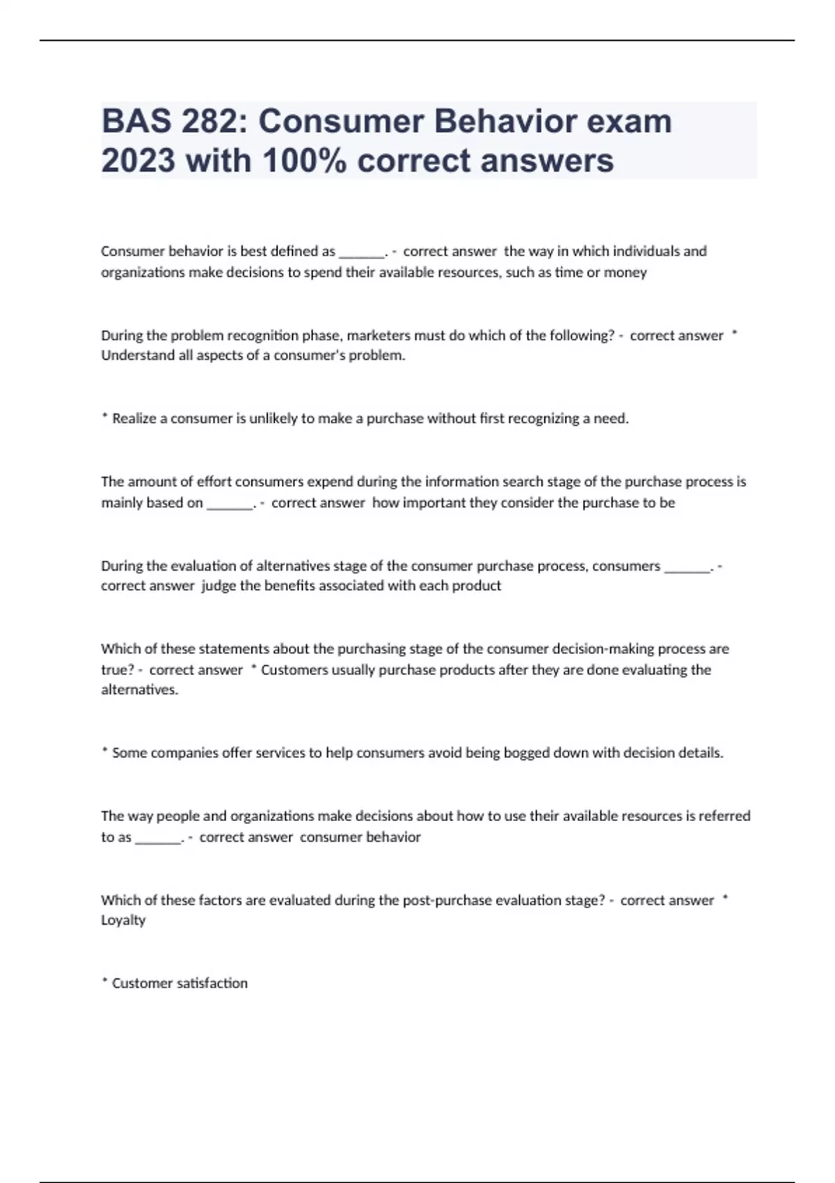 BAS 282: Consumer Behavior exam 2023 with 100% correct answers