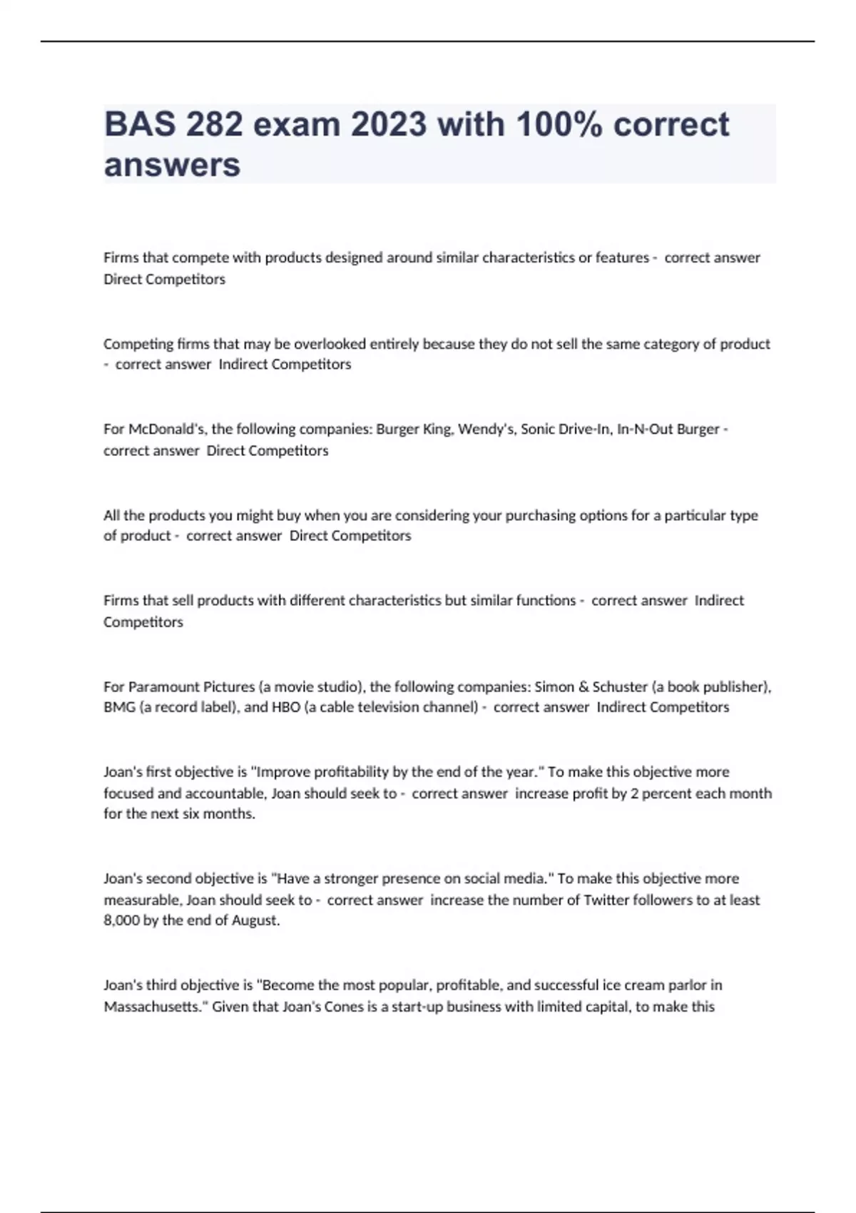 Firms that compete with products designed around similar characteristics or features - correct answer Direct Competitors Competing firms that may be overlooked entirely because they do not sell the same category of product - correct answer Indirect Competitors For McDonald's, the following companies: Burger King, Wendy's, Sonic Drive-In, In-N-Out Burger - correct answer Direct Competitors All the products you might buy when you are considering your purchasing options for a particular type of product - correct answer Direct Competitors Firms that sell products with different characteristics but similar functions - correct answer Indirect Competitors For Paramount Pictures (a movie studio), the following companies: Simon & Schuster (a book publisher), BMG (a record label), and HBO (a cable television channel) - correct answer Indirect Competitors Joan's first objective is "Improve profitability by the end of the year." To make this objective more focused and accountable, Joan should seek to - correct answer increase profit by 2 percent each month for the next six months.