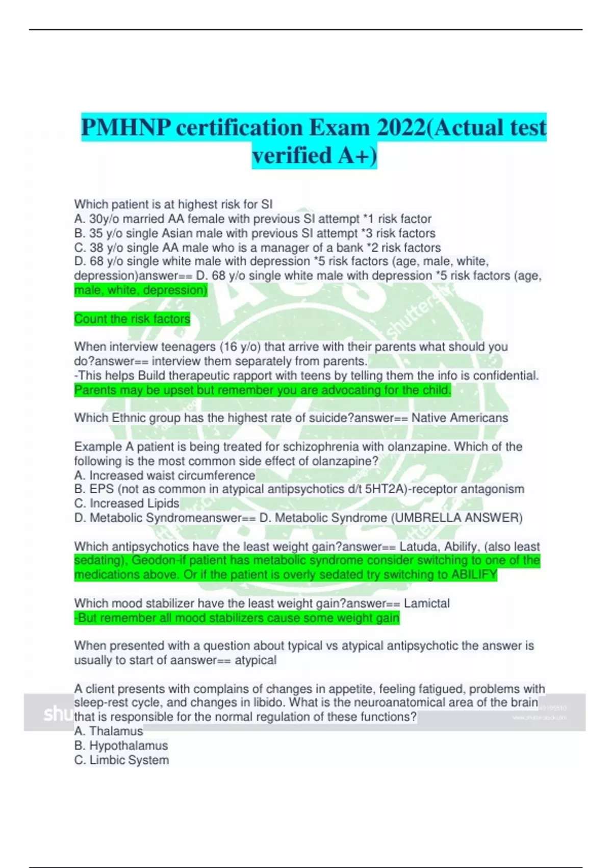 PMHNP certification Exam 2022(Actual test verified A+) Which patient is at highest risk for SI A. 30y/o married AA female with previous SI attempt *1 risk factor B. 35 y/o single Asian male with previous SI attempt *3 risk factors C. 38 y/o single AA male who is a manager of a bank *2 risk factors D. 68 y/o single white male with depression *5 risk factors (age, male, white, depression)answer== D. 68 y/o single white male with depression *5 risk factors (age, male, white, depression) Count the risk factors When interview teenagers (16 y/o) that arrive with their parents what should you do?answer== interview them separately from parents. -This helps Build therapeutic rapport with teens by telling them the info is confidential. Parents may be upset but remember you are advocating for the child.