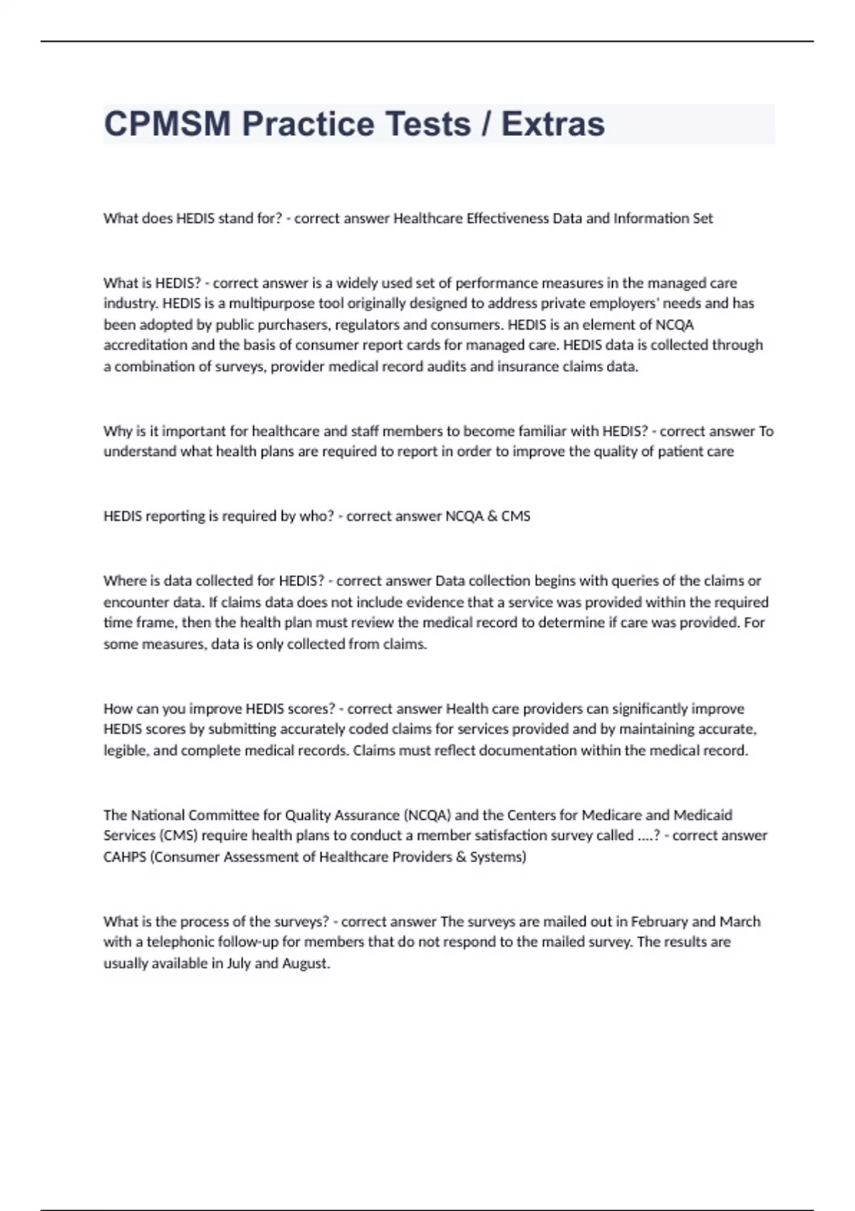 CPMSM Practice Tests Extras What does HEDIS stand for? - correct answer Healthcare Effectiveness Data and Information Set What is HEDIS? - correct answer is a widely used set of performance measures in the managed care industry. HEDIS is a multipurpose tool originally designed to address private employers' needs and has been adopted by public purchasers, regulators and consumers. HEDIS is an element of NCQA accreditation and the basis of consumer report cards for managed care. HEDIS data is collected through a combination of surveys, provider medical record audits and insurance claims data. Why is it important for healthcare and staff members to become familiar with HEDIS? - correct answer To understand what health plans are required to report in order to improve the quality of patient care HEDIS reporting is required by who? - correct answer NCQA & CMS Where is data collected for HEDIS? - correct answer Data collection begins with queries of the claims or encounter data. If claims data does not include evidence that a service was provided within the required time frame, then the health plan must review the medical record to determine if care was provided. For some measures, data is only collected from claims. How can you improve HEDIS scores? - correct answer Health care providers can significantly improve HEDIS scores by submitting accurately coded claims for services provided and by maintaining accurate, legible, and complete medical records. Claims must reflect documentation within the medical record. The National Committee for Quality Assurance (NCQA) and the Centers for Medicare and Medicaid Services (CMS) require health plans to conduct a member satisfaction survey called ....? - correct answer CAHPS (Consumer Assessment of Healthcare Providers & Systems) What is the process of the surveys? - correct answer The surveys are mailed out in February and March with a telephonic follow-up for members that do not respond to the mailed survey. The results are usually available in July and August. How many questions in the CAHPS survey? - correct answer approximately 70 questions and measures the satisfaction of the member with the health plan, provider accessibility, patient/provider relationship and communication. CAHPS Questions include: - correct answer - Shared decision making (Commercial Measure) - Health promotion and education (Commercial Measure) - Coordination of care (Commercial Measure) - How well physician communicates (Commercial, Medicare, and Medicaid) - Getting care quickly (Commercial, Medicare, and Medicaid) - Getting needed care (Commercial, Medicare, and Medicaid - Rating of health care (Commercial, Medicare, and Medicaid) - Rating of personal physician (Commercial, Medicare, and Medicaid) - Rating of specialist (Commercial, Medicare, and Medicaid) - Ratings of health plan (Commercial, Medicare, and Medicaid) The CAHPS survey also contains questions regarding: - correct answer - whether the patient received the flu/pneumonia vaccine - directions on the use of aspirin - physician discussion on tobacco cessation Institutional review Board is under who's authority? - correct answer FDA (federal drug administration) Institutional Review Board - correct answer Group that has been formally designated to review and monitor biomedical research. For Low volume practitioners (TJC) supplemental data may be used from...? - correct answer another CMS-certified organization where practitioner holds the same privileges. (Must be in the bylaws) Does HFAP require collab agreements for midlevels? - correct answer Yes, per state regulations