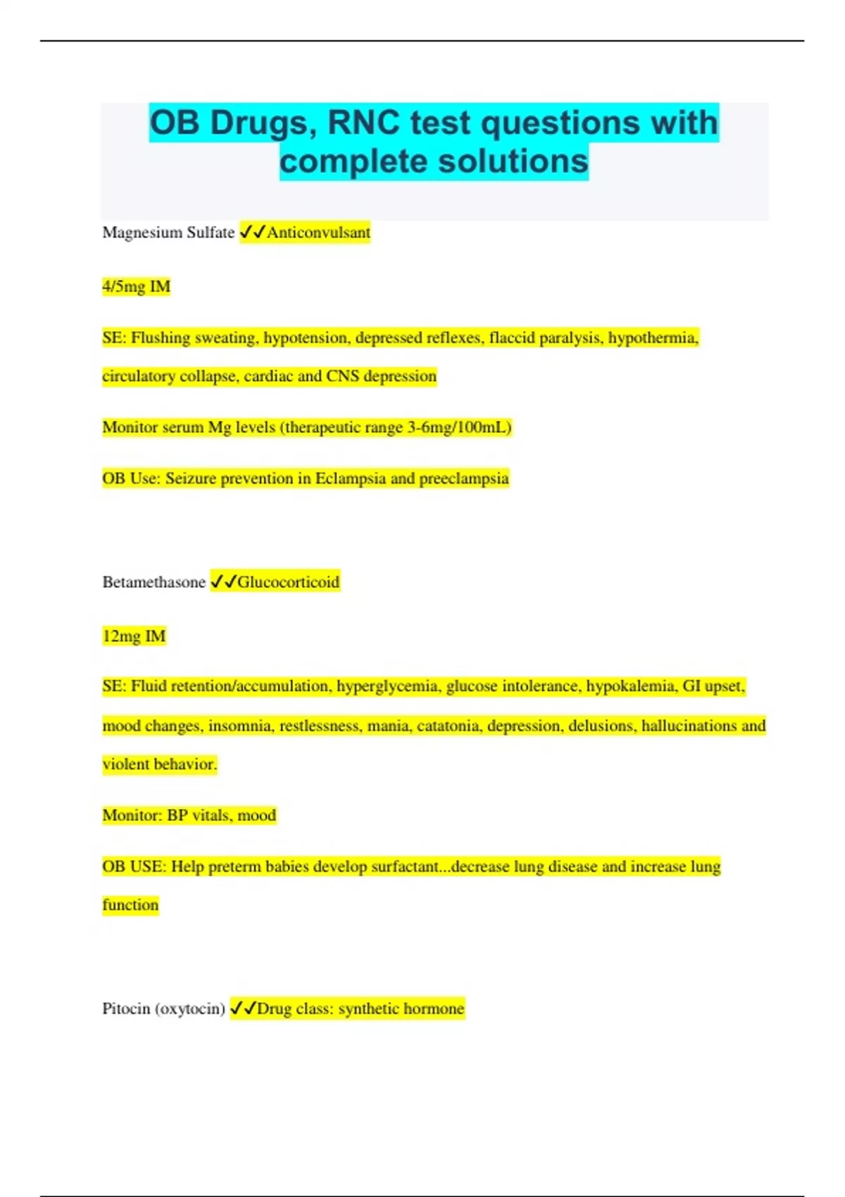 OB Drugs, RNC test questions with complete solutions Magnesium Sulfate Anticonvulsant 4/5mg IM SE: Flushing sweating, hypotension, depressed reflexes, flaccid paralysis, hypothermia, circulatory collapse, cardiac and CNS depression Monitor serum Mg levels (therapeutic range 3-6mg/100mL) OB Use: Seizure prevention in Eclampsia and preeclampsia Betamethasone Glucocorticoid 12mg IM SE: Fluid retention/accumulation, hyperglycemia, glucose intolerance, hypokalemia, GI upset, mood changes, insomnia, restlessness, mania, catatonia, depression, delusions, hallucinations and violent behavior. Monitor: BP vitals, mood OB USE: Help preterm babies develop surfactant...decrease lung disease and increase lung function Pitocin (oxytocin) Drug class: synthetic hormone Usual dose/route: IV standard concentration of 10 units to 1000ml, 20 units to 1000ml and 30 units in 500ml Admin through a second line connected to main line and always by pump. Begin dosage at 1 milliunit per minute and increase the rate by 1-2 milliunits per minute no more frequently than every 30-60 minutes based on progression of labor. Side effects: MATERNAL: uterine tachysystole (more than 5 contractions in 10 min or a series of single contractions lasting greater than or = to 2 min or contractions of normal duration occurring within 1 minute of each other), placental abruptions, uterine rupture, unnecessary c section due to abnormal FHR and patterns, postpartum hemorrhaging, and infection. FETAL: hypoxemia and acidosis eventually resulting in abnormal FHR and patterns. Use in obstetrics: primarily used for labor induction and augmentation, stimulate lactation, prevent hemorrhage post partum. Patient teaching: explain reasons for usage, effects Cytotec (Misoprostol) Drug class: Prostaglandin E1 (PGE1) Usual dose/route: 100 or 200 mcg tablet which is prepared in pharmacy to ensure proper dosage. Initial dose is 25mcg inserted transvaginally into the posterior of the vaginal fornix using the tips of the index and middle fingers WITHOUT lubricant. Repeat every 3-6 hours up to 6 doses in a 24 hour period or until and effective contraction pattern is established, the cervix ripens (Bishop score of 8 or more) or adverse reactions occur. Side effects: higer doses more likely to cause nausea vomiting, diarrhea, fever, uterine tachysystole, with or withought an abnormal FHR and patterns or fetal passage of meconium. The risk for adverse reactions is reduced with lower doses at longer intervals between doses. Use in obstetrics: Used to ripen the cervix making it softer and causing it to begin to dilate and efface, stimulating contractions. Patient teaching: : explain procedure to patient and family. Void before insertion, must maintain a supine Methergine (Methylergonovine maleate) Drug class: ADRENERGIC ANTAGONIST; ERGOT; OXYTOCIC Usual dose/route: 0.2 mg IM every 2-4hours up to 5 doses may also be given intrauterine or orally. Side effects: hypertension, nausea, vomiting, headache. Use in obstetrics: contraction of the uterus. Patient teaching: Report severe cramping or ↑bleeding.Report cold or numb fingers/toes, n/v, chest/muscle pain. Rubella vaccine Drug class: Vaccine Usual dose/route:I0.5 mL subcutaneously into the outer aspect of the upper arm. Side effects: Difficulty in breathing or swallowing, hives, itching, especially of feet or hands, reddening of skin, especially around ears, swelling of eyes, face, or inside