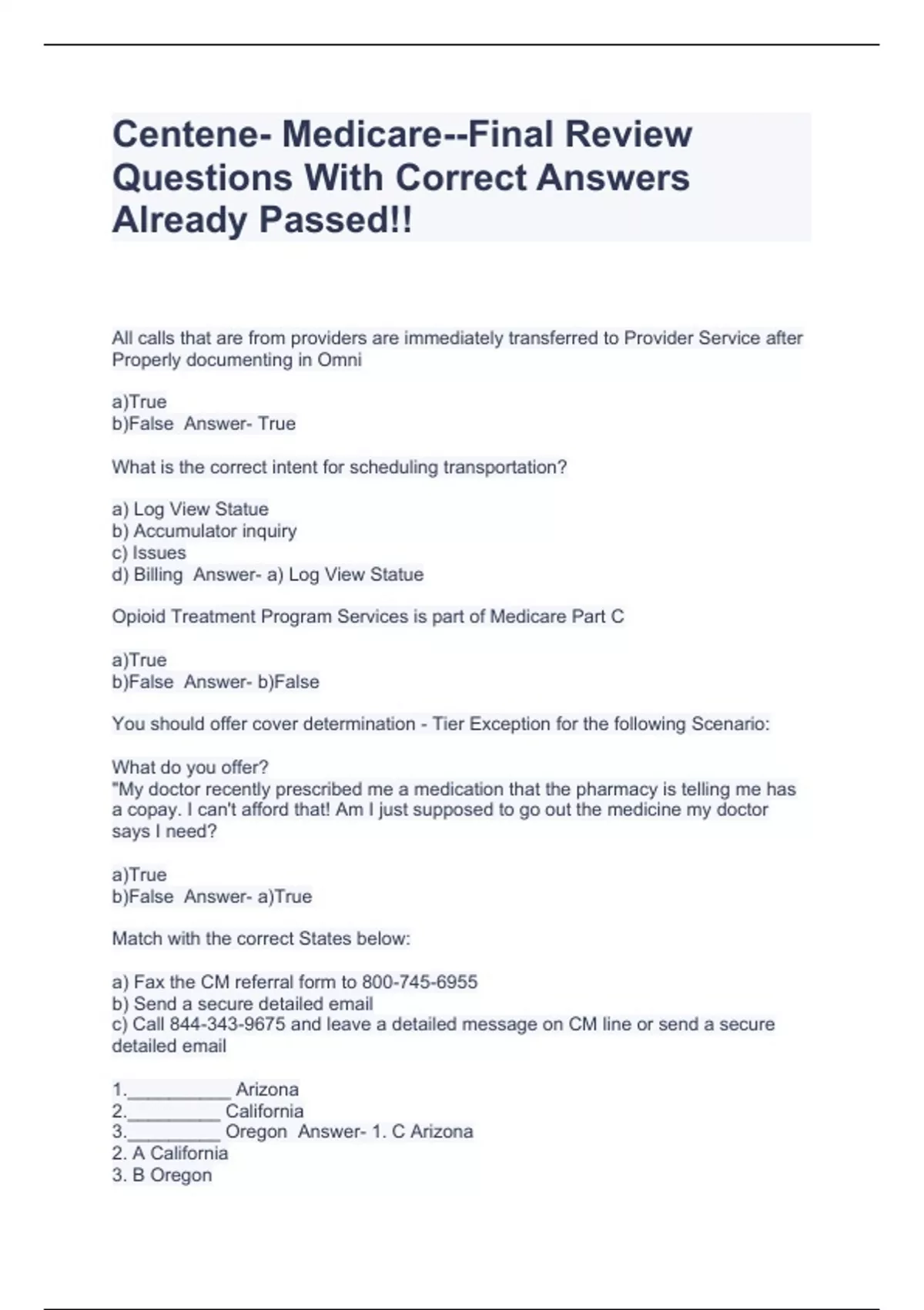 Centene- Medicare--Final Review Questions With Correct Answers Already Passed!!