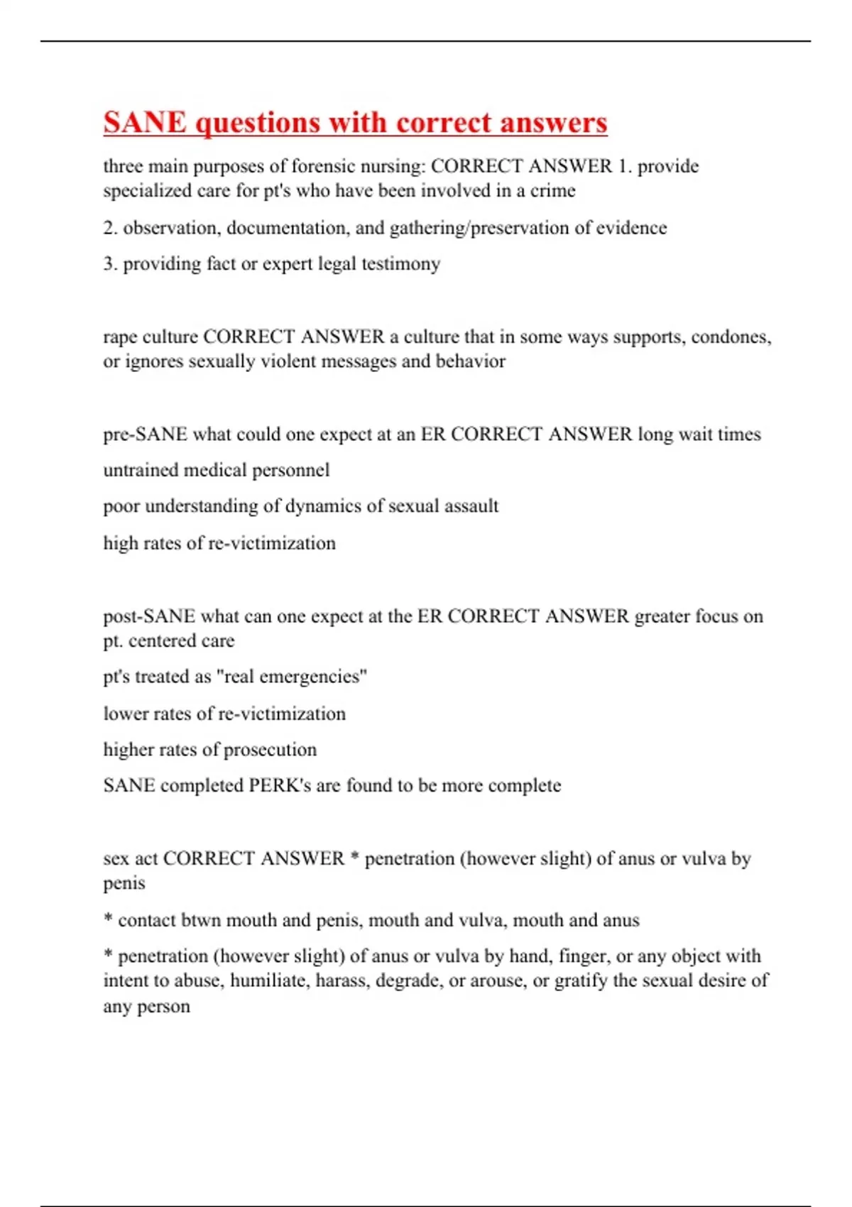 three main purposes of forensic nursing: CORRECT ANSWER 1. provide specialized care for pt's who have been involved in a crime 2. observation, documentation, and gathering/preservation of evidence 3. providing fact or expert legal testimony rape culture CORRECT ANSWER a culture that in some ways supports, condones, or ignores sexually violent messages and behavior pre-SANE what could one expect at an ER CORRECT ANSWER long wait times untrained medical personnel poor understanding of dynamics of sexual assault high rates of re-victimization post-SANE what can one expect at the ER CORRECT ANSWER greater focus on pt. centered care pt's treated as "real emergencies" lower rates of re-victimization higher rates of prosecution SANE completed PERK's are found to be more complete sex act CORRECT ANSWER * penetration (however slight) of anus or vulva by penis * contact btwn mouth and penis, mouth and vulva, mouth and anus * penetration (however slight) of anus or vulva by hand, finger, or any object with intent to abuse, humiliate, harass, degrade, or arouse, or gratify the sexual desire of any person