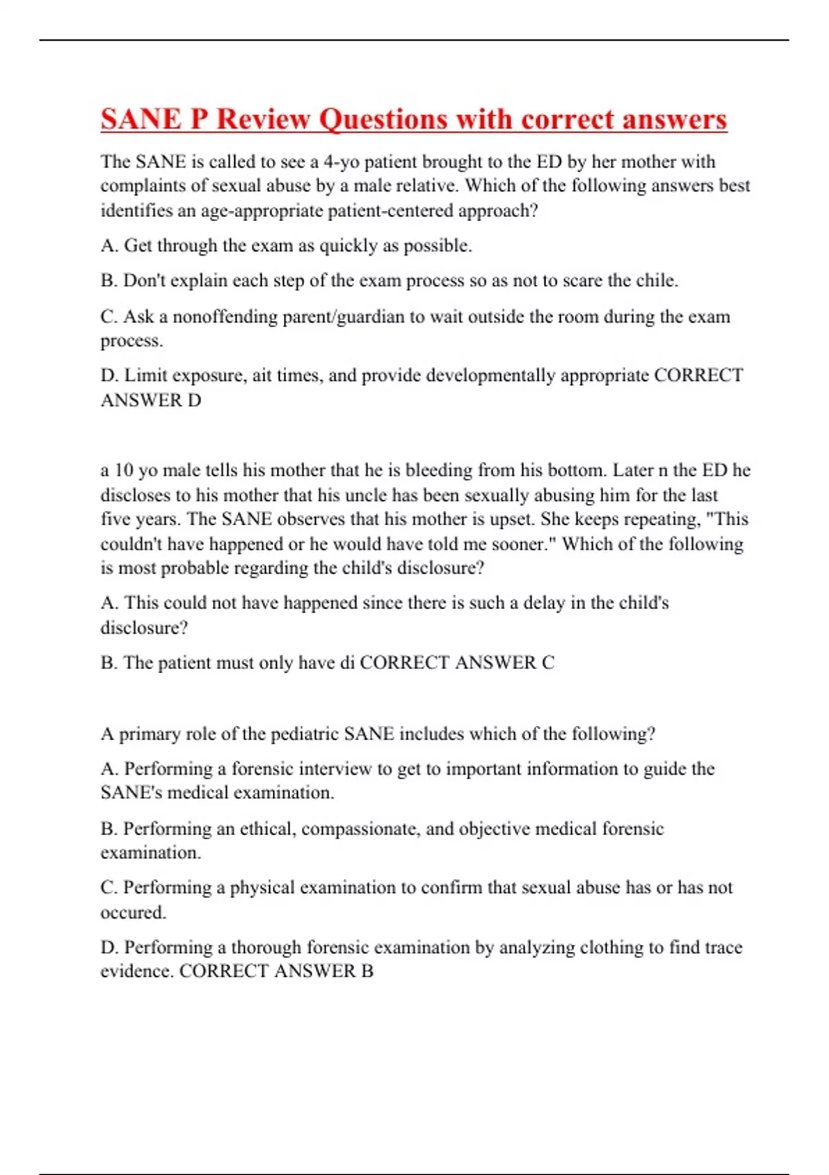 The SANE is called to see a 4-yo patient brought to the ED by her mother with complaints of sexual abuse by a male relative. Which of the following answers best identifies an age-appropriate patient-centered approach? A. Get through the exam as quickly as possible. B. Don't explain each step of the exam process so as not to scare the chile. C. Ask a nonoffending parent/guardian to wait outside the room during the exam process. D. Limit exposure, ait times, and provide developmentally appropriate CORRECT ANSWER D a 10 yo male tells his mother that he is bleeding from his bottom. Later n the ED he discloses to his mother that his uncle has been sexually abusing him for the last five years. The SANE observes that his mother is upset. She keeps repeating, "This couldn't have happened or he would have told me sooner." Which of the following is most probable regarding the child's disclosure? A. This could not have happened since there is such a delay in the child's disclosure? B. The patient must only have di CORRECT ANSWER C A primary role of the pediatric SANE includes which of the following? A. Performing a forensic interview to get to important information to guide the SANE's medical examination. B. Performing an ethical, compassionate, and objective medical forensic examination. C. Performing a physical examination to confirm that sexual abuse has or has not occured. D. Performing a thorough forensic examination by analyzing clothing to find trace evidence. CORRECT ANSWER B