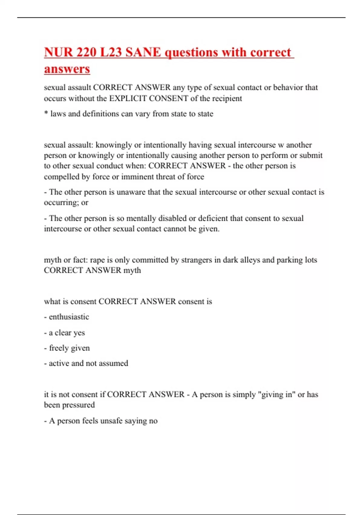 sexual assault CORRECT ANSWER any type of sexual contact or behavior that occurs without the EXPLICIT CONSENT of the recipient * laws and definitions can vary from state to state sexual assault: knowingly or intentionally having sexual intercourse w another person or knowingly or intentionally causing another person to perform or submit to other sexual conduct when: CORRECT ANSWER - the other person is compelled by force or imminent threat of force - The other person is unaware that the sexual intercourse or other sexual contact is occurring; or - The other person is so mentally disabled or deficient that consent to sexual intercourse or other sexual contact cannot be given. myth or fact: rape is only committed by strangers in dark alleys and parking lots CORRECT ANSWER myth what is consent CORRECT ANSWER consent is - enthusiastic - a clear yes - freely given - active and not assumed