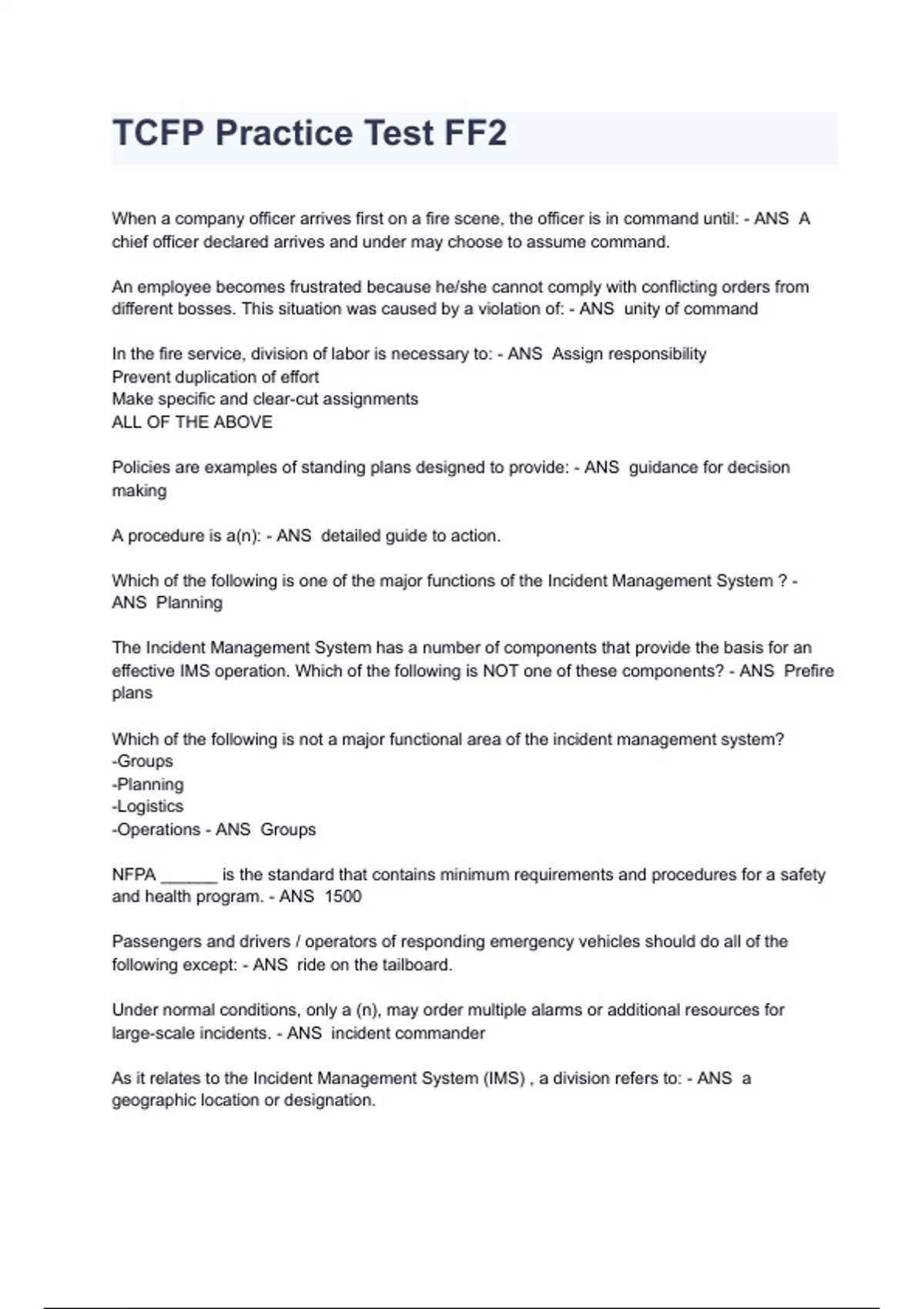 TCFP Practice Test FF2 Questions And Answers (A GRADED 100% VERIFIED) When a company officer arrives first on a fire scene, the officer is in command until: - ANS A chief officer declared arrives and under may choose to assume command. An employee becomes frustrated because he/she cannot comply with conflicting orders from different bosses. This situation was caused by a violation of: - ANS unity of command In the fire service, division of labor is necessary to: - ANS Assign responsibility Prevent duplication of effort Make specific and clear-cut assignments ALL OF THE ABOVE Policies are examples of standing plans designed to provide: - ANS guidance for decision