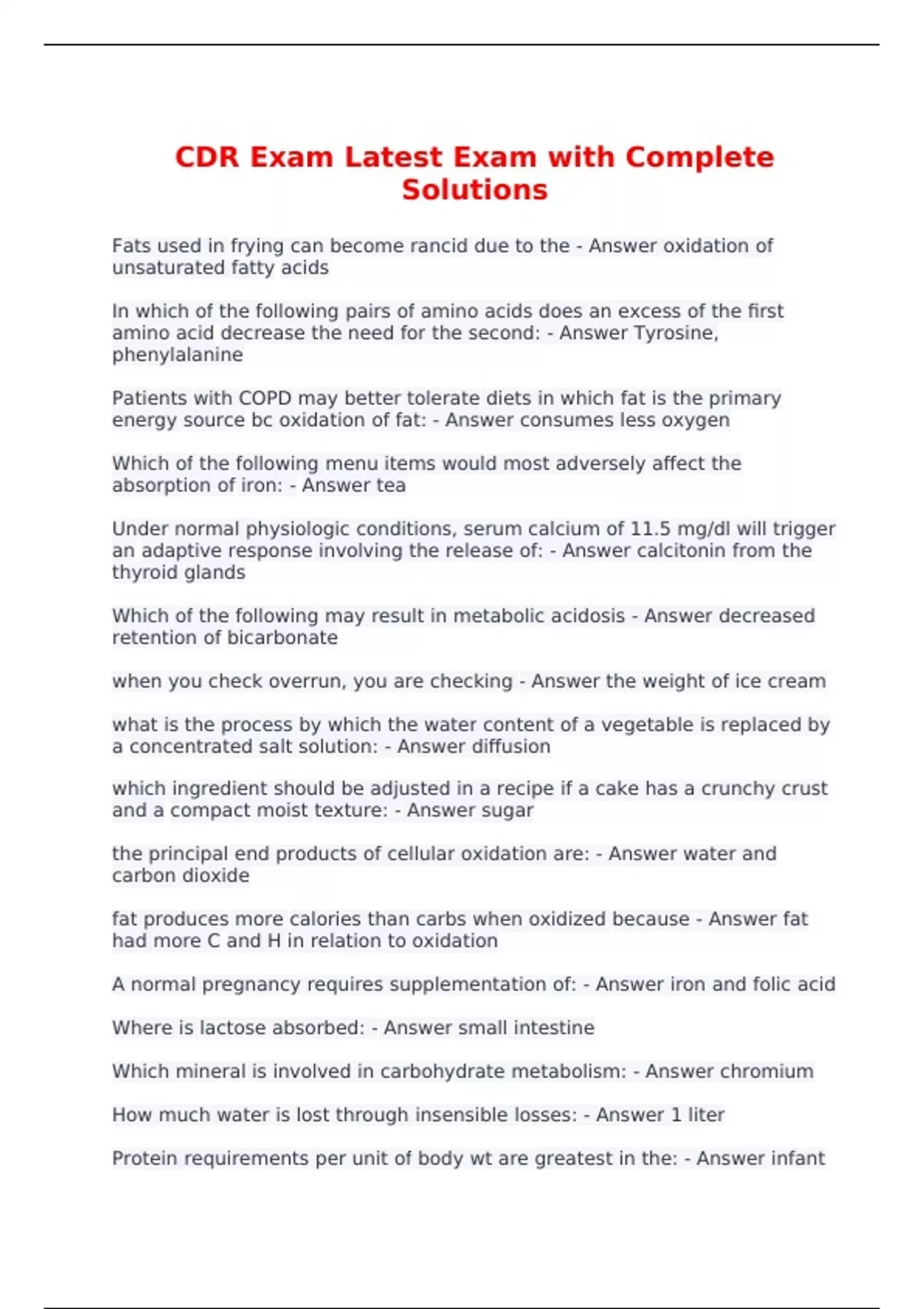CDR Exam Latest Exam with Complete Solutions Fats used in frying can become rancid due to the - Answer oxidation of unsaturated fatty acids