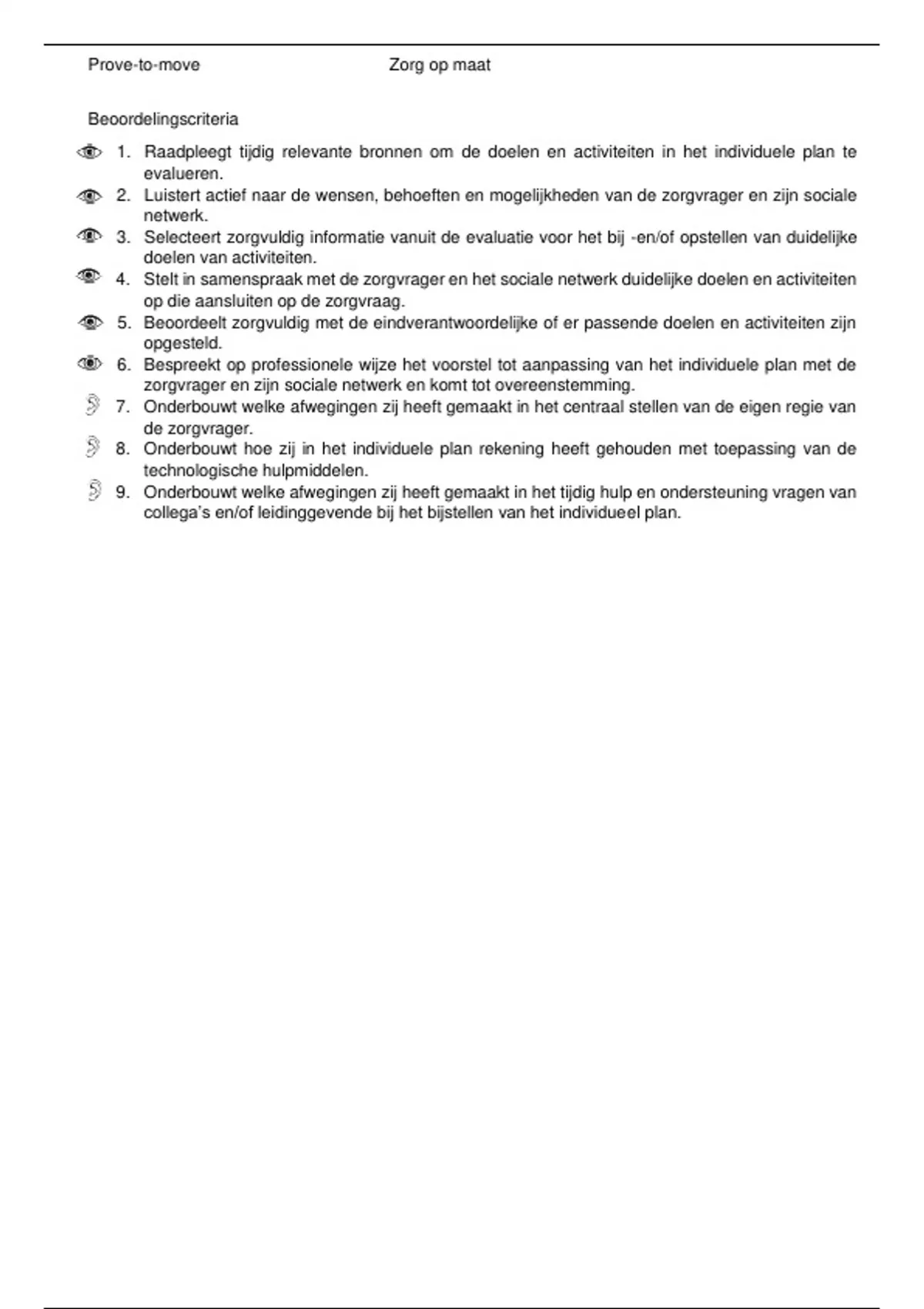 beoordelingscriteria zorg op maat. We mochten deze niet kopiëren omdat het strafbaar is, maar mochten het wel overnemen vanuit school. Dus dit ook zo gedaan en meteen gecorrigeerd in de mannelijke en vrouwelijke vorm.