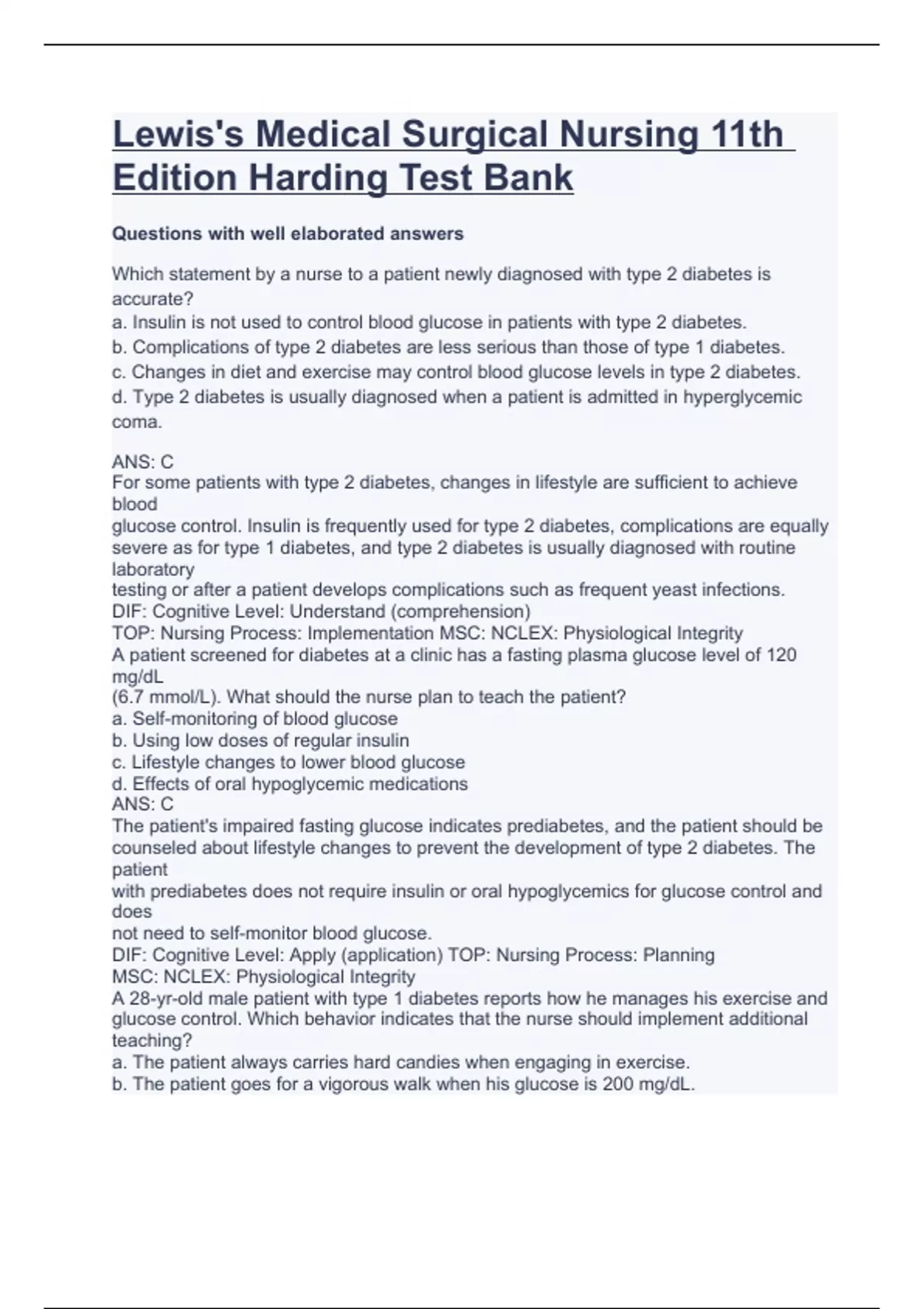 Which statement by a nurse to a patient newly diagnosed with type 2 diabetes is accurate? a. Insulin is not used to control blood glucose in patients with type 2 diabetes. b. Complications of type 2 diabetes are less serious than those of type 1 diabetes. c. Changes in diet and exercise may control blood glucose levels in type 2 diabetes. d. Type 2 diabetes is usually diagnosed when a patient is admitted in hyperglycemic coma. ANS: C For some patients with type 2 diabetes, changes in lifestyle are sufficient to achieve blood glucose control. Insulin is frequently used for type 2 diabetes, complications are equally severe as for type 1 diabetes, and type 2 diabetes is usually diagnosed with routine laboratory testing or after a patient develops complications such as frequent yeast infections. DIF: Cognitive Level: Understand (comprehension) TOP: Nursing Process: Implementation MSC: NCLEX: Physiological Integrity A patient screened for diabetes at a clinic has a fasting plasma glucose level of 120 mg/dL (6.7 mmol/L). What should the nurse plan to teach the patient? a. Self-monitoring of blood glucose b. Using low doses of regular insulin c. Lifestyle changes to lower blood glucose d. Effects of oral hypogly