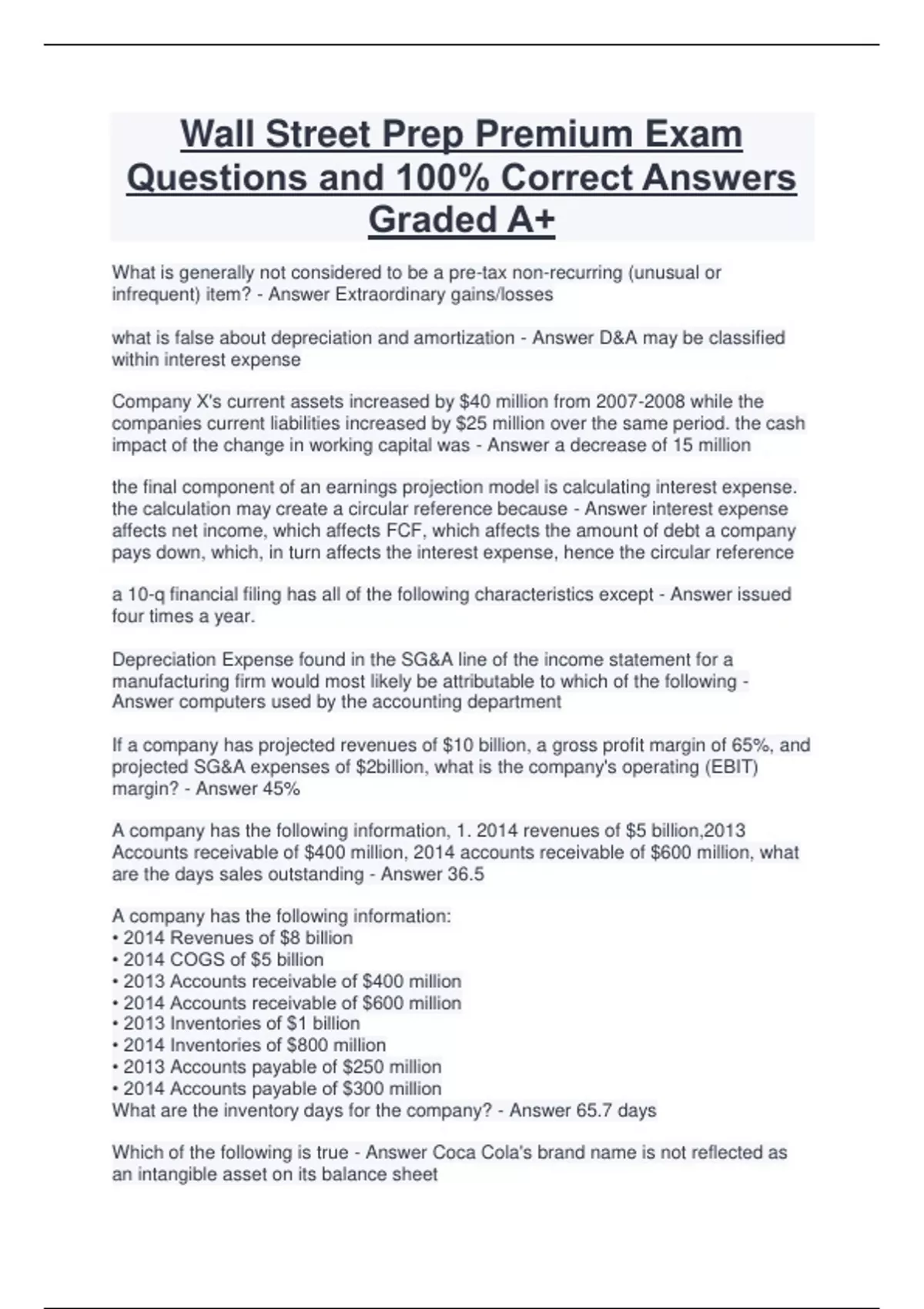 Wall Street Prep Premium Exam Questions and 100% Correct Answers Graded A+