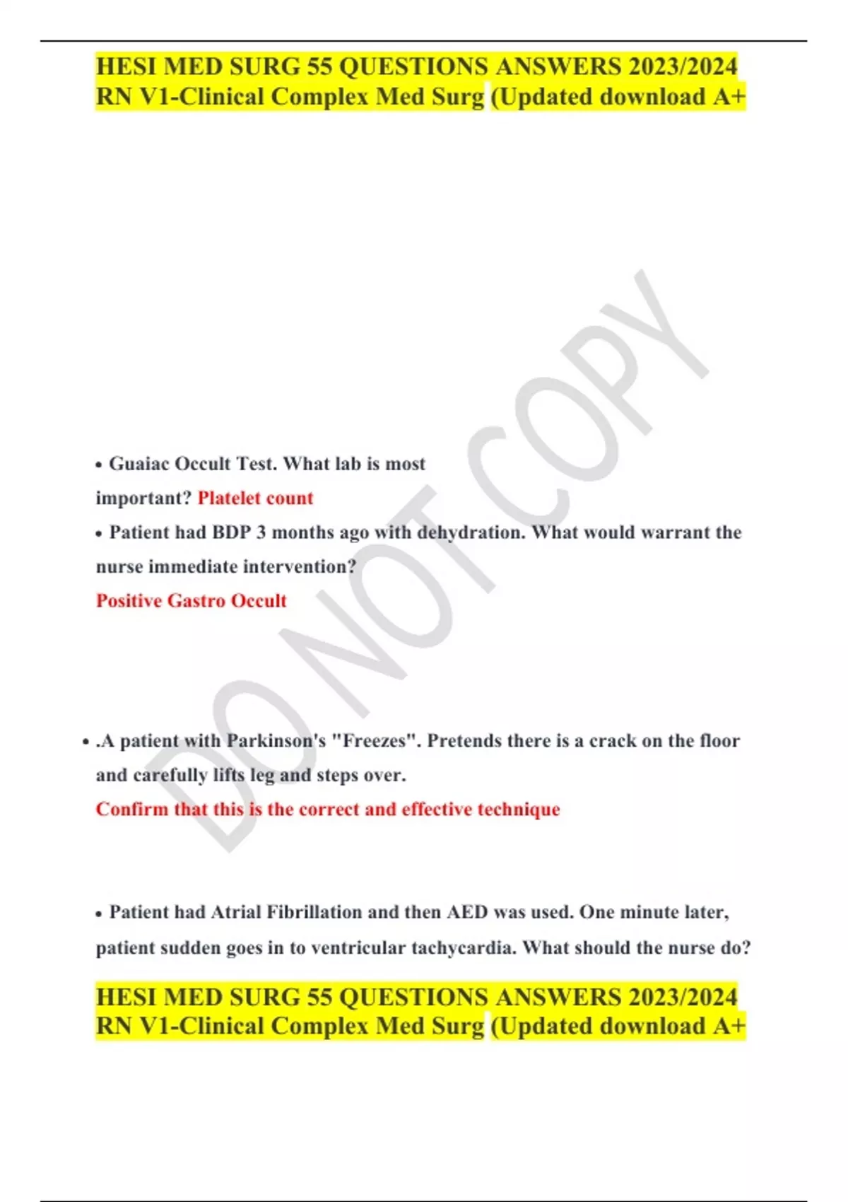 • Guaiac Occult Test. What lab is most important? Platelet count • Patient had BDP 3 months ago with dehydration. What would warrant the nurse immediate intervention? Positive Gastro Occult • .A patient with Parkinson's "Freezes". Pretends there is a crack on the floor and carefully lifts leg and steps over. Confirm that this is the correct and effective technique • Patient had Atrial Fibrillation and then AED was used. One minute later, patient sudden goes in to ventricular tachycardia. What should the nurse do? Administer adenosine over 1-2 seconds IV • Heart failure acute exacerbation. How to reduce cardiac workload? Bedside commode • External fixation device- what should the nurse do first? Assess for peripheral pulse at the foot • COPD patient is experience shortness of breath. pursed lip breathing • Client with CVA (stroke). Has only eaten half of their food. Family is concern about nutrition. What should the nurse tell the family?