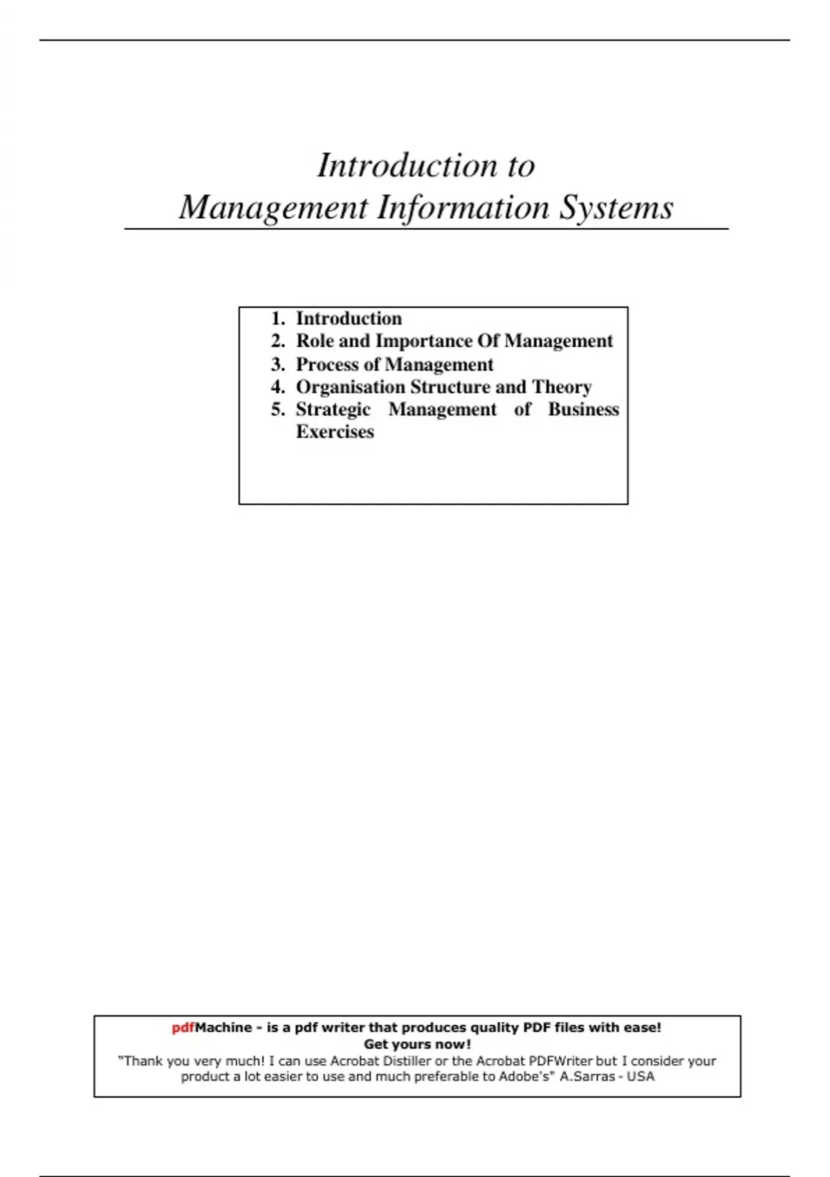 Introduction to Management Information Systems Latest Verified Review 2023 Practice Questions and Answers for Exam Preparation, 100% Correct with Explanations, Highly Recommended, Download to Score A+ . Introduction 2. Role and Importance Of Management 3. Process of Management 4. Organisation Structure and Theory 5. Strategic Management of Business Exercises