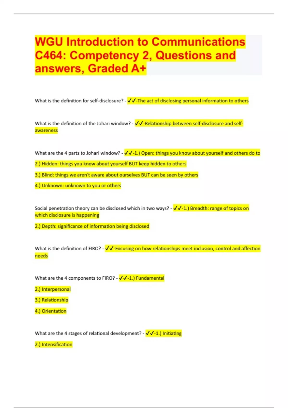 WGU Introduction to Communications C464: Competency 2, Questions and answers, Graded A+ What is the definition for self-disclosure? - -The act of disclosing personal information to others What is the definition of the Johari window? - -Relationship between self-disclosure and selfawareness What are the 4 parts to Johari window? - -1.) Open: things you know about yourself and others do to 2.) Hidden: things you know about yourself BUT keep hidden to others 3.) Blind: things we aren't aware about ourselves BUT can be seen by others 4.) Unknown: unknown to you or others Social penetration theory can be disclosed which in two ways? - -1.) Breadth: range of topics on which disclosure is happening 2.) Depth: significance of information being disclosed What is the definition of FIRO? - -Focusing on how relationships meet inclusion, control and affection needs What are the 4 components to FIRO? - -1.) Fundamental 2.) Interpersonal 3.) Relationship 4.) Orientation What are the 4 stages of relational development? -