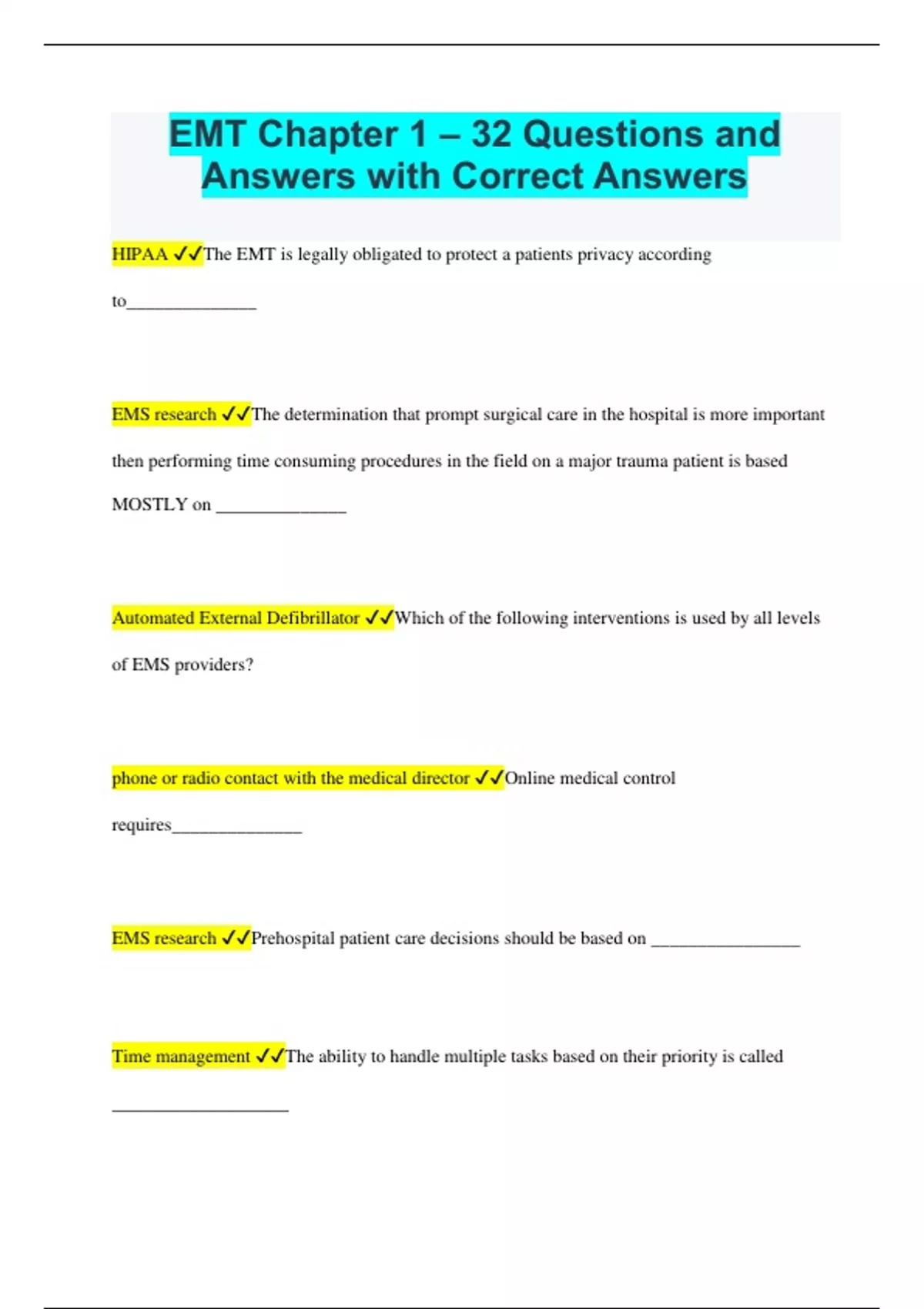 EMT Chapter 1 – 32 Questions and Answers with Correct Answers
