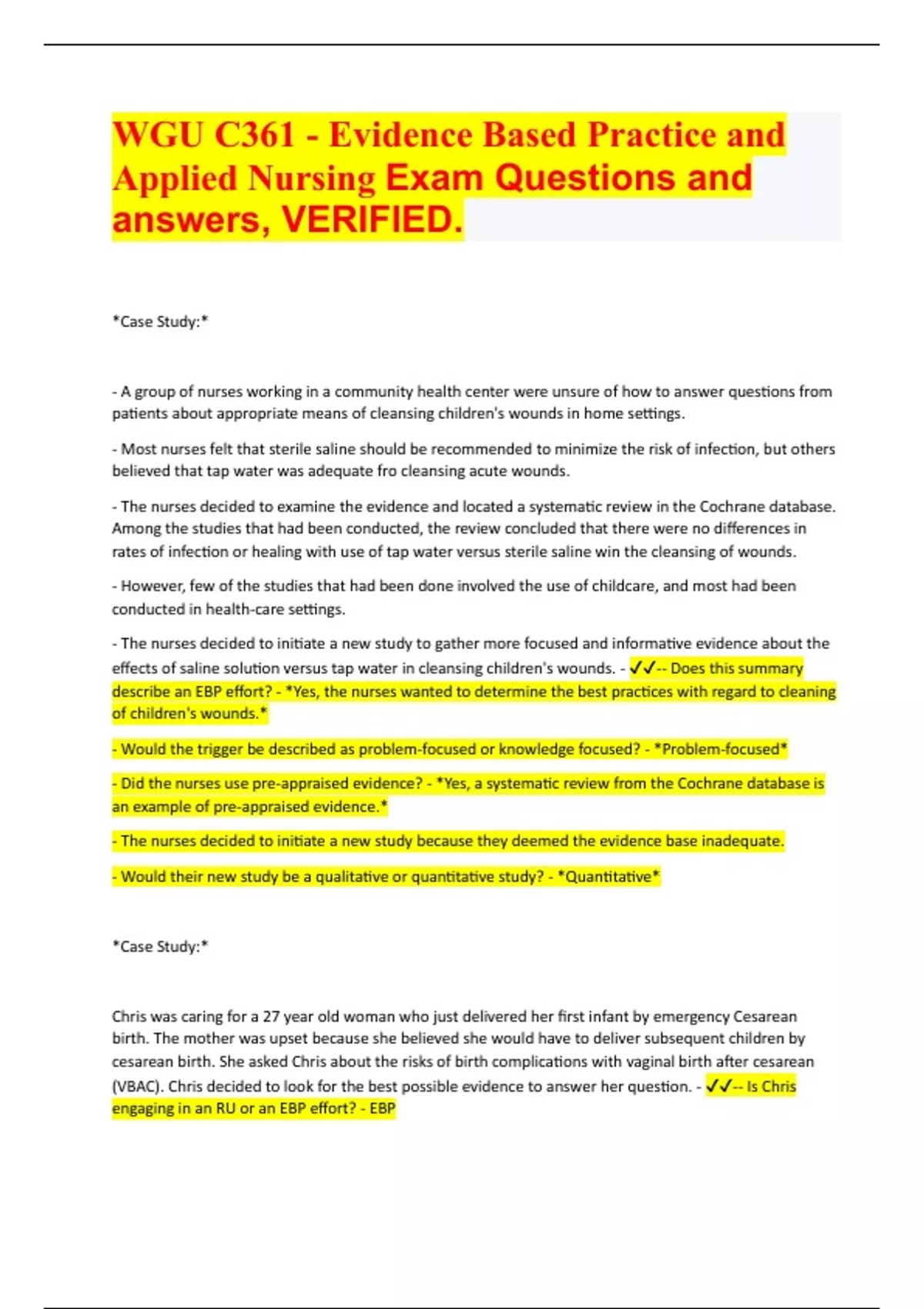 WGU C361 - Evidence Based Practice and Applied Nursing Exam Questions and answers, VERIFIED. *Case Study:* - A group of nurses working in a community health center were unsure of how to answer questions from patients about appropriate means of cleansing children's wounds in home settings. - Most nurses felt that sterile saline should be recommended to minimize the risk of infection, but others believed that tap water was adequate fro cleansing acute wounds. - The nurses decided to examine the evidence and located a systematic review in the Cochrane database. Among the studies that had been conducted, the review concluded that there were no differences in rates of infection or healing with use of tap water versus sterile saline win the cleansing of wounds. - However, few of the studies that had been done involved the use of childcare, and most had been conducted in health-care settings. - The nurses decided to initiate a new study to gather more focused and informative evidence about the effects of saline solution versus tap water in cleansing children's wounds. - -- Does this summary describe an EBP effort? - *Yes, the nurses wanted to determine the best practices with regard to cleaning of children's wounds.* - Would the trigger be described as problem-focused or knowledge focused? - *Problem-focused* - Did the nurses use pre-appraised evidence? - *Yes, a systematic review from the Cochrane database is an example of pre-appraised evidence.* - The nurses decided to initiate a new study because they deemed the evidence base inadequate. - Would their new study be a qualitative or quantitative study? - *Quantitative* *Case Study:* Chris was caring for a 27 year old woman who just delivered her first infant by emergency Cesarean birth. The mother was upset because she believed she would have to deliver subsequent children by cesarean birth. She asked Chris about the risks of birth complications with vaginal birth after cesarean (VBAC). Chris decided to look for the best possible evidence to answer her question. - -- Is Chris engaging in an RU or an EBP effort? - EBP - Would the trigger be described as problem-focused or knowledge-foc