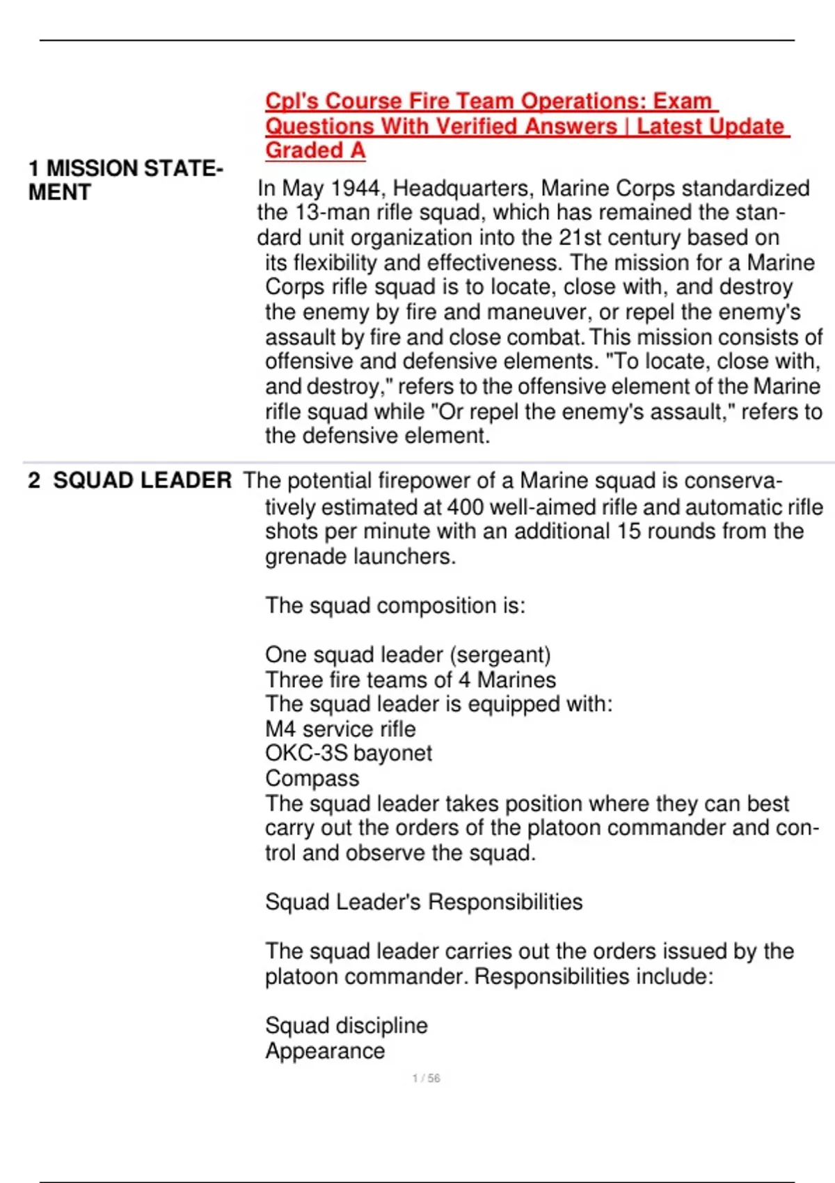 Cpl's Course Fire Team Operations: Exam Questions With Verified Answers | Latest Update Graded A