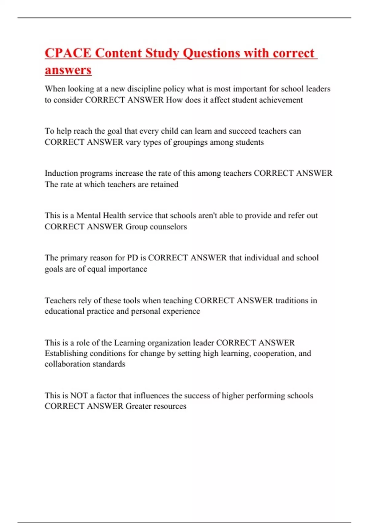 When looking at a new discipline policy what is most important for school leaders to consider CORRECT ANSWER How does it affect student achievement To help reach the goal that every child can learn and succeed teachers can CORRECT ANSWER vary types of groupings among students Induction programs increase the rate of this among teachers CORRECT ANSWER The rate at which teachers are retained This is a Mental Health service that schools aren't able to provide and refer out CORRECT ANSWER Group counselors The primary reason for PD is CORRECT ANSWER that individual and school goals are of equal importance Teachers rely of these tools when teaching CORRECT ANSWER traditions in educational practice and personal experience This is a role of the Learning organization leader CORRECT ANSWER Establishing conditions for change by setting high learning, cooperation, and collaboration standards This is NOT a factor that influences the success of higher performing schools CORRECT ANSWER Greater resources