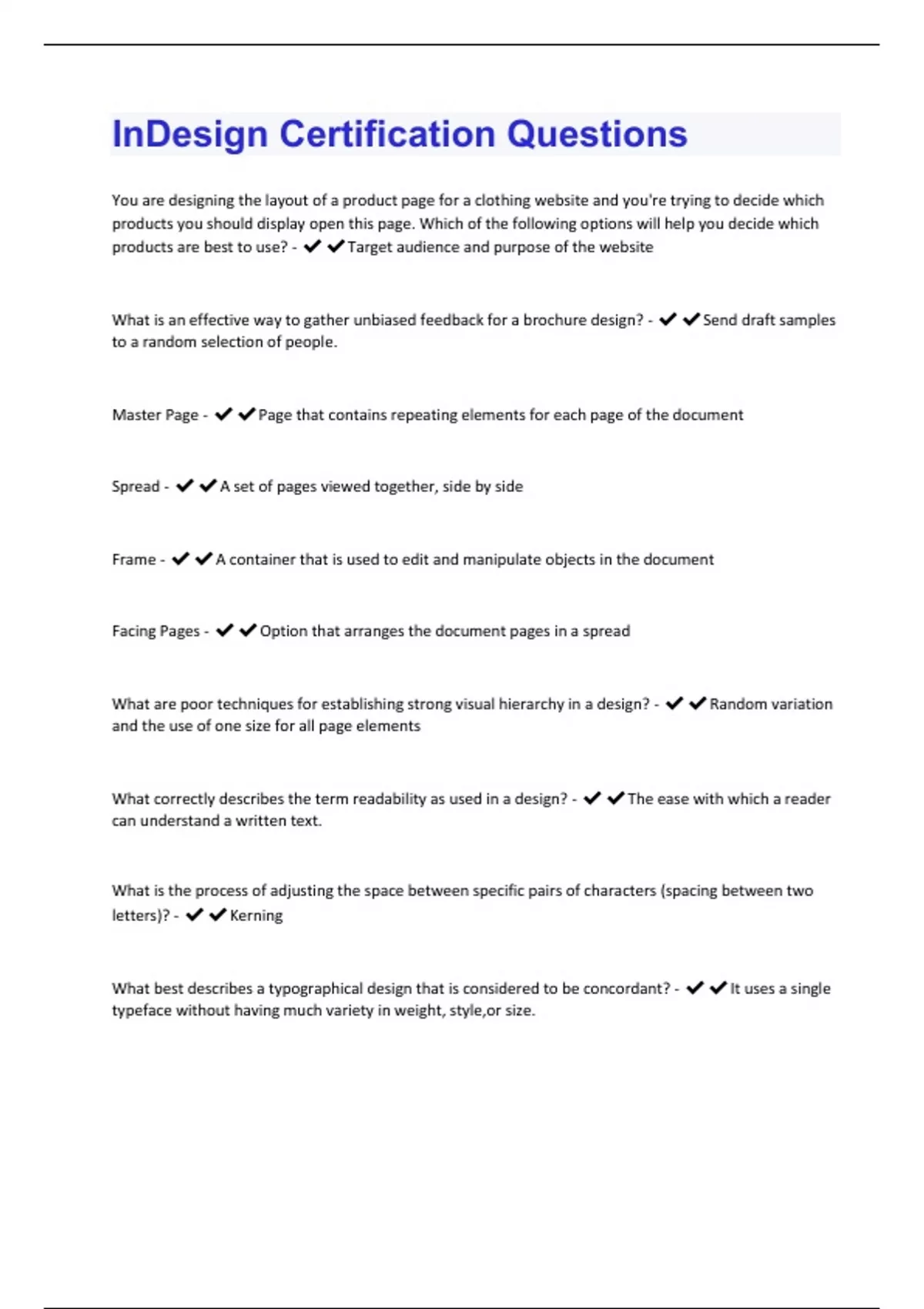You are designing the layout of a product page for a clothing website and you're trying to decide which products you should display open this page. Which of the following options will help you decide which products are best to use? - Target audience and purpose of the website What is an effective way to gather unbiased feedback for a brochure design? -Send draft samples to a random selection of people. Master Page - Page that contains repeating elements for each page of the document Spread - A set of pages viewed together, side by side Frame - A container that is used to edit and manipulate objects in the document Facing Pages - Option that arranges the document pages in a spread What are poor techniques for establishing strong visual hierarchy in a design? - Random variation and the use of one size for all page elements What correctly describes the term readability as used in a design? - The ease with which a reader can understand a written text. What is the process of adjusting the space between specific pairs of characters (spacing between two letters)? - Kerning What best describes a typographical design that is considered to be concordant? - It uses a single typeface without having much variety in weight, style,or size.You are preparing your business card design to be printed at a commercial printer. What main ink type's exact color appearance is determined by the printer and requires a printing plate for each color? - Spot Color Scaling - Changes the size of an image to be printed on paper. Resampling - Changes the number of pixels in an image. Cropping - Removes designated parts of an image to get a new width and height. Resizing - Increase or decrease the size of an object. What is associated with print publications and not digital publications? - Scaling, Process Color, and Dpi Character Panel - Sets the options for selected text