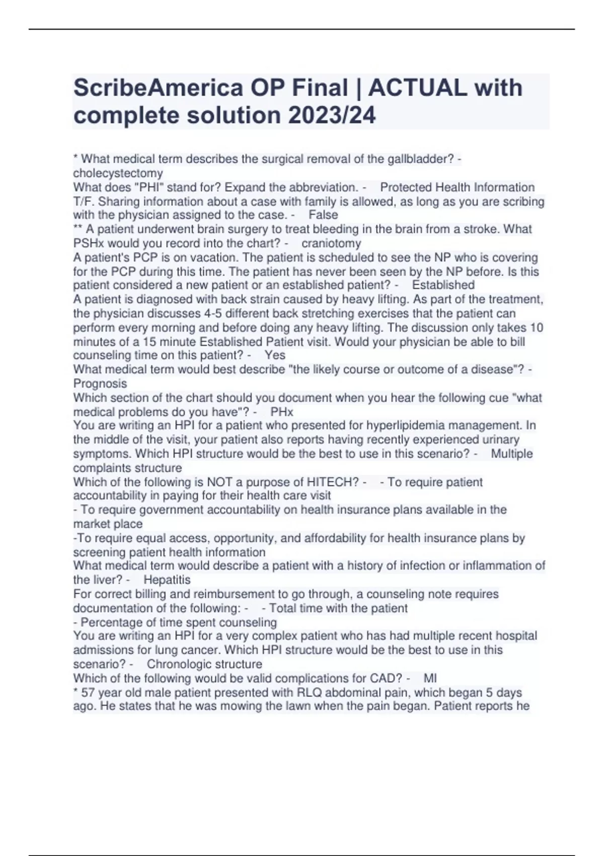 ScribeAmerica OP Final | ACTUAL with complete solution 2023/24 * What medical term describes the surgical removal of the gallbladder? - cholecystectomy What does "PHI" stand for? Expand the abbreviation. - Protected Health Information T/F. Sharing information about a case with family is allowed, as long as you are scribing with the physician assigned to the case. - False ** A patient underwent brain surgery to treat bleeding in the brain from a stroke. What PSHx would you record into the chart? - craniotomy A patient's PCP is on vacation. The patient is scheduled to see the NP who is covering for the PCP during this time. The patient has never been seen by the NP before. Is this patient considered a new patient or an established patient? - Established A patient is diagnosed with back strain caused by heavy lifting. As part of the treatment, the physician discusses 4-5 different back stretching exercises that the patient can perform every morning and before doing any heavy lifting. The discussion only takes 10 minutes of a 15 minute Established Patient visit. Would your physician be able to bill counseling time on this patient? - Yes What medical term would best describe "the likely course or outcome of a disease"? - Prognosis Which section of the chart should you document when you hear the following cue "what