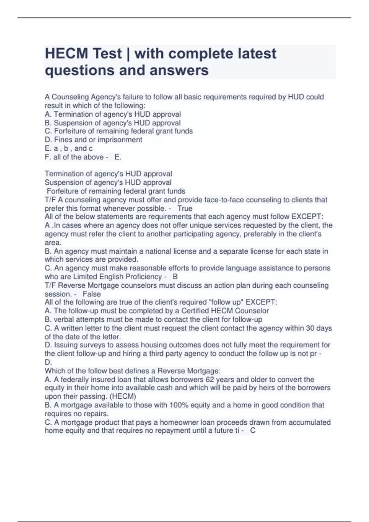HECM Test | with complete latest questions and answers A Counseling Agency's failure to follow all basic requirements required by HUD could result in which of the following: A. Termination of agency's HUD approval B. Suspension of agency's HUD approval C. Forfeiture of remaining federal grant funds D. Fines and or imprisonment E. a , b , and c F. all of the above - E. Termination of agency's HUD approval Suspension of agency's HUD approval Forfeiture of remaining federal grant funds T/F A counseling agency must offer and provide face-to-face counseling to clients that prefer this format whenever possible. - True All of the below statements are requirements that each agency must follow EXCEPT: A .In cases where an agency does not offer unique services requested by the client, the agency must refer the client to another participating agency, preferably in the client's area. B. An agency must maintain a national license and a separate license for each state in which services are provided. C. An agency must make reasonable efforts to provide language assistance to persons who are Limited English Proficiency - B T/F Reverse Mortgage counselors must discuss an action plan during each counseling session. - False All of the following are true of the client's required "follow up" EXCEPT: A. The follow-up must be completed by a Certified HECM Counselor B. verbal attempts must be made to contact the client for follow-up C. A written letter to the client must request the client contact the agency within 30 days of the date of the letter. D. Issuing surveys to assess housing outcomes does not fully meet the requirement for the client follow-up and hiring a third party agency to conduct the follow up is not pr - D. Which of the follow best defines a Reverse Mortgage: A. A federally insured loan that allows borrowers 62 years and older to convert the equity in their home into available cash and which will be paid by heirs of the borrowers upon their passing. (HECM) B. A mortgage available to those with 100% equity and a home in good condition that requires no repairs. C. A mortgage product that pays a homeowner loan proceeds drawn from accumulated home equity and that requires no repayment until a future ti - C T/F Agencies are permitted to conduct marketing and outreach including providing general information about housing opportunities and raising awareness about critical housing topics. - True An agency's staff will be required to have an up-to-date knowledge of which of the following: A. All FHA Single Family mortgage programs B.Lender product availability and rate offerings C.Mortgagee letters D. HUD's website for information on products and guidelines () E. a , b , c F. a , c , d - F T/F To receive a FHA HECM loan, a borrower must first receive One-on-One Counseling from a certified HECM Counselor. - True T/F A reverse mortgage counseling agency may charge a fee that exceeds the actual cost to provide the service but only clients and related parties that are able to afford the fee. - False T/F Clients must not be turned away because of an inability to pay counseling fee - False All are true of entities eligible to provide Reverse Mortgage Counseling EXCEPT: A.An agency must have an affiliating lending institution in order to stay updated with updating lending practices. B. An agency must be have an Active Status on the HECM Roster C. An agency must receive continuing education every two years D. An agency must have access to a technology that allows for adequate HUD reporting - A. What are the names of the 2 HUD Booklets that each client must receive before completing a counseling session? - Preparing for Your Counseling Session Use Your Home to Stay at Home - A Guide for Homeowners Who Need Help Now Each counseling session must include discussion on all of the following EXCEPT: A. Basic Requirements to the Reverse Mortgage B. Alternatives to the Reverse Mortgage C. Fees and costs associated with the Reverse Mortgage D. Title retention E. All of the above - E If the national lending limit is $625,500 and a client's estimated appraised value is $820,000, what figure are the proposal calculations based on? A. 625,500 B. 820,000 C. 204,500 D. The answer would depend on the regional lending limit - A If the national lending limit is $625,500 and a client's estimated appraised value is $820,000, what is this calculation called? - Maximum Claim Amount (Lending limit is the same thing) T/F Borr