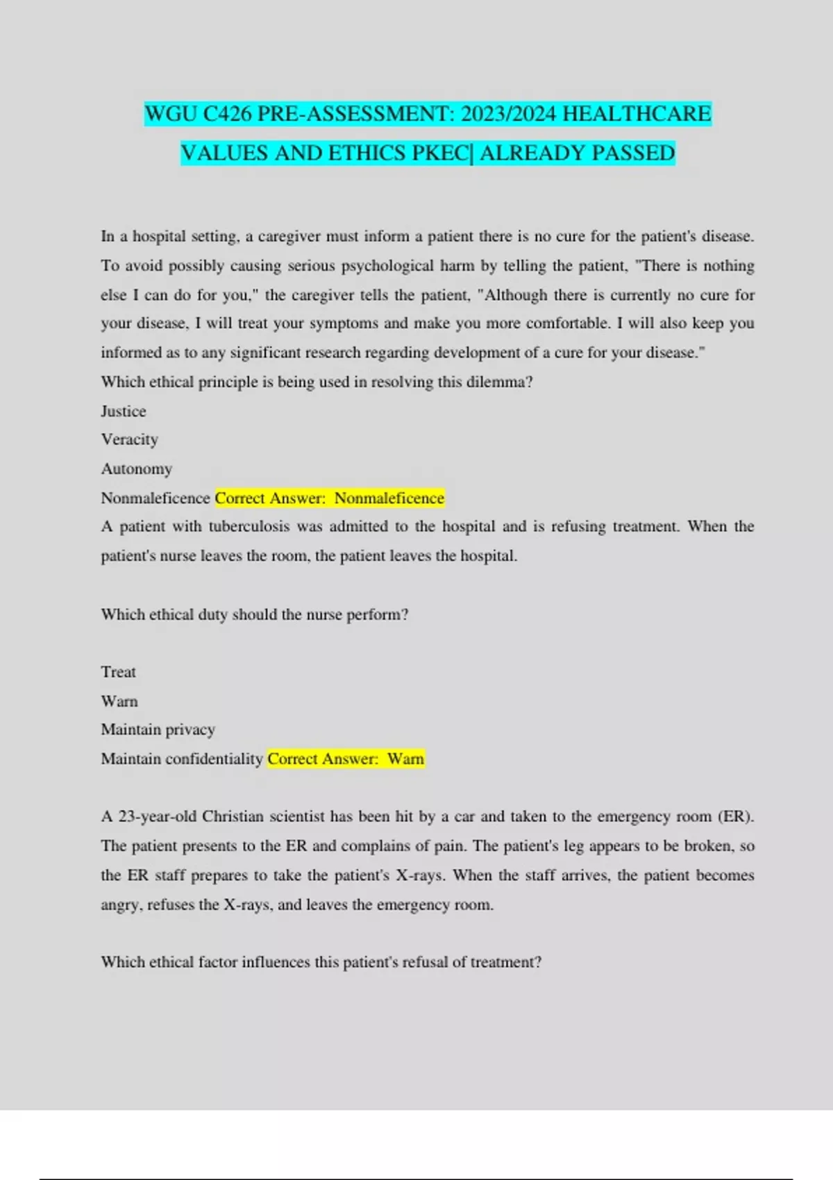 WGU C426 PRE-ASSESSMENT: 2023/2024 HEALTHCARE VALUES AND ETHICS PKEC| ALREADY PASSED