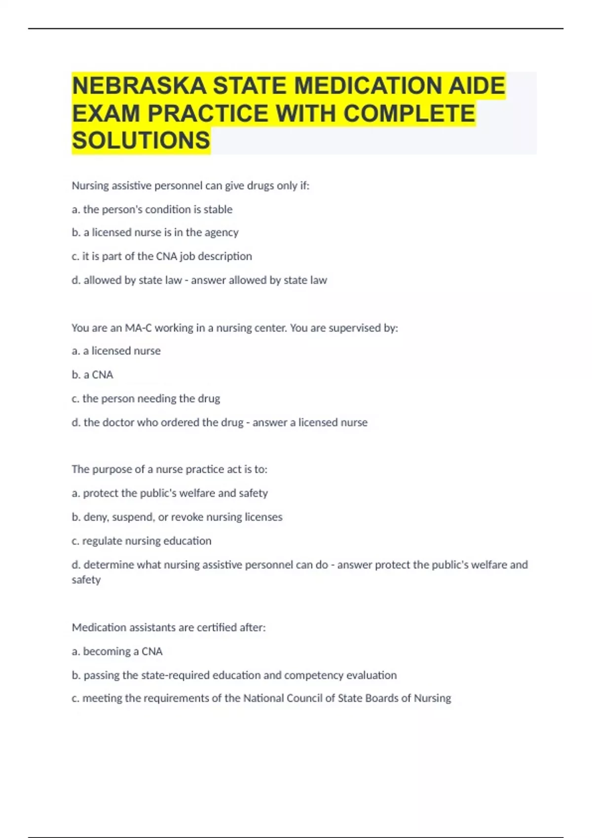 NEBRASKA STATE MEDICATION AIDE EXAM PRACTICE WITH COMPLETE SOLUTIONS