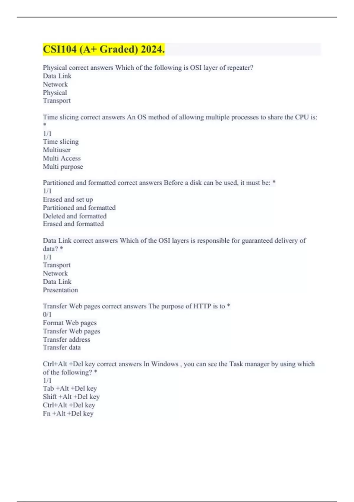 Physical correct answers Which of the following is OSI layer of repeater? Data Link Network Physical Transport Time slicing correct answers An OS method of allowing multiple processes to share the CPU is: * 1/1 Time slicing Multiuser Multi Access Multi purpose Partitioned and formatted correct answers Before a disk can be used, it must be: * 1/1 Erased and set up Partitioned and formatted Deleted and formatted Erased and formatted Data Link correct answers Which of the OSI layers is responsible for guaranteed delivery of data? * 1/1 Transport Network Data Link Presentation Transfer Web pages correct answers The purpose of HTTP is to * 0/1 Format Web pages Transfer Web pages Transfer address Transfer data Ctrl+Alt +Del key correct answers In Windows , you can see the Task manager by using which of the following? * 1/1 Tab +Alt +Del key Shift +Alt +Del key Ctrl+Alt +Del key Fn +Alt +Del key