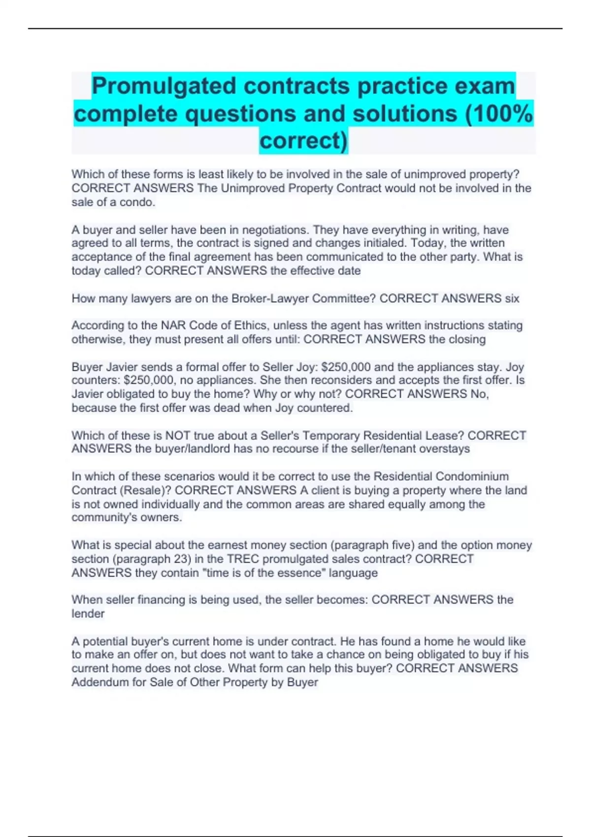 Promulgated contracts practice exam complete questions and solutions (100% correct)