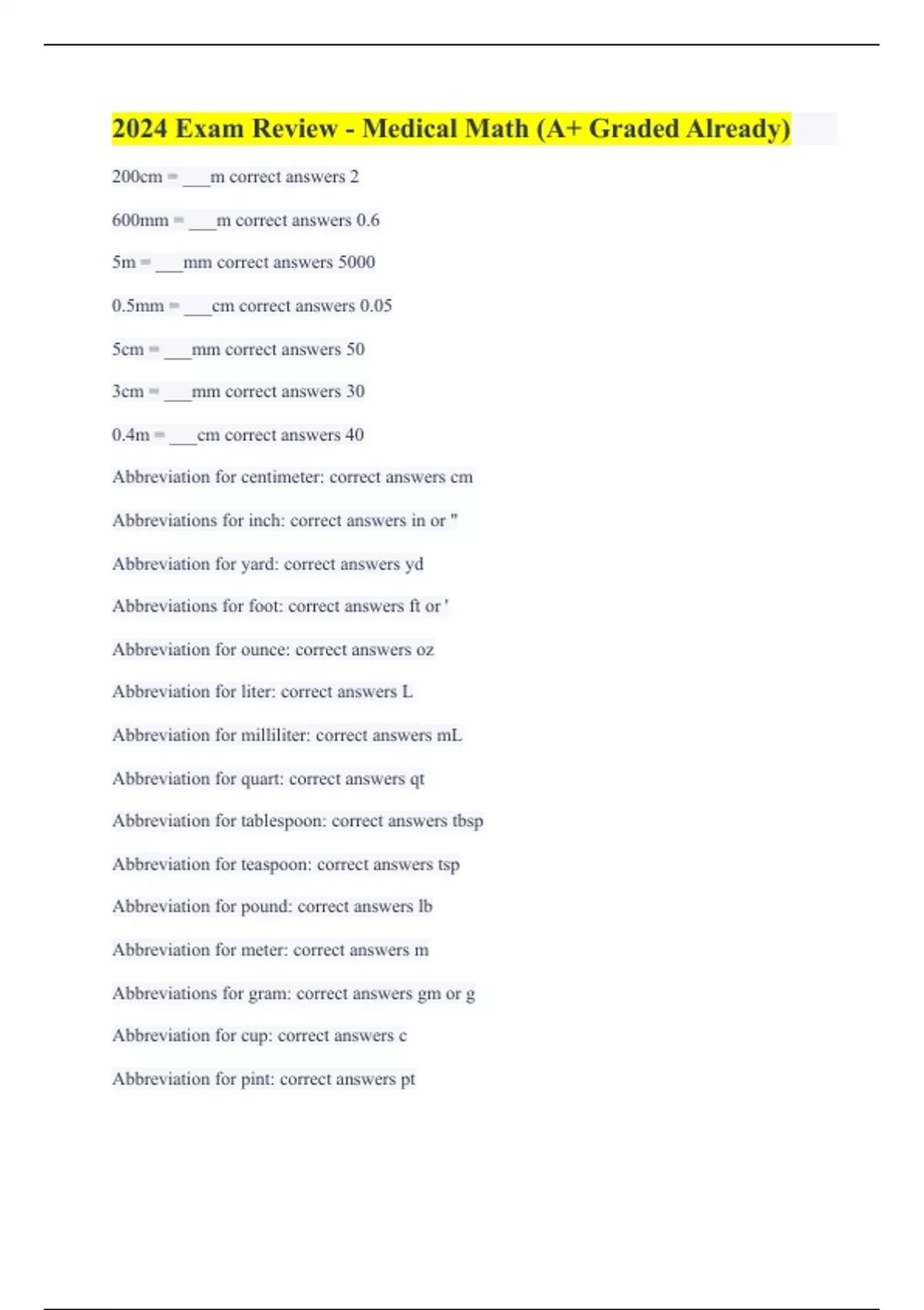 2024 Exam Review - Medical Math (A+ Graded Already)