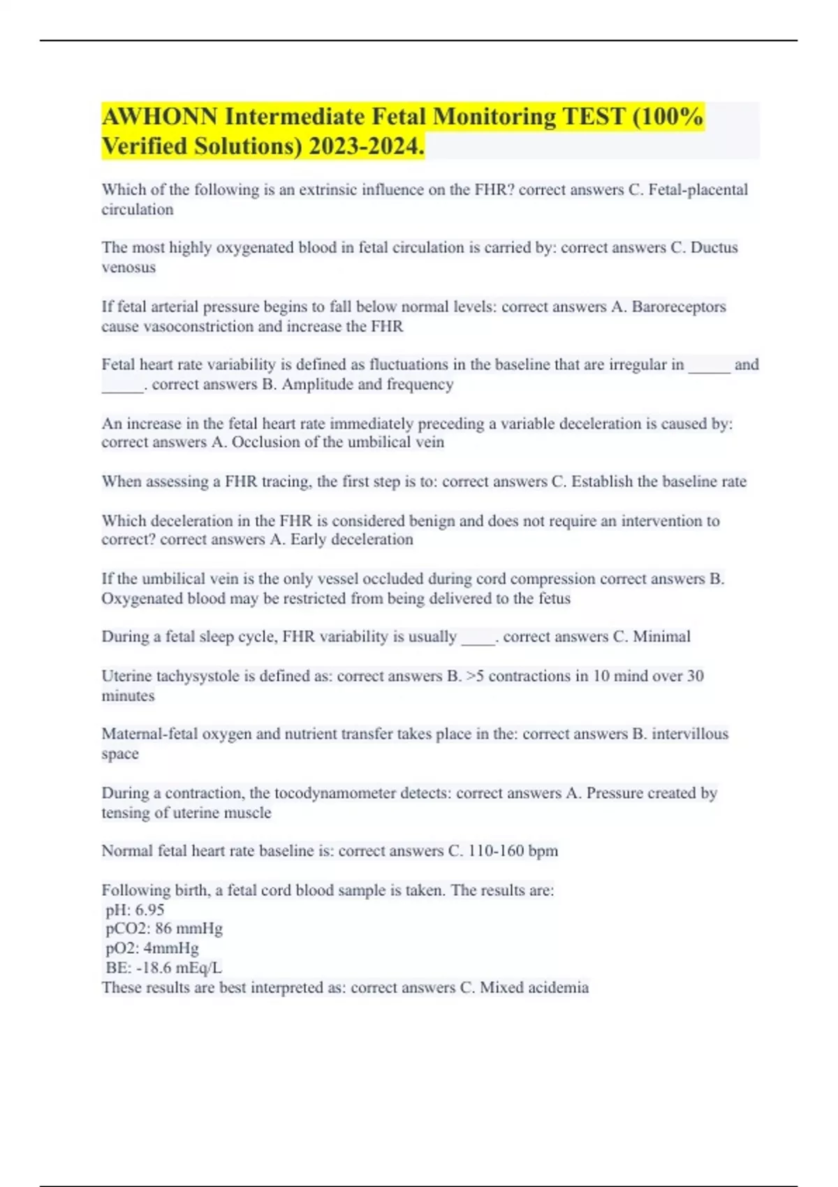 AWHONN Intermediate Fetal Monitoring TEST (100% Verified Solutions) .