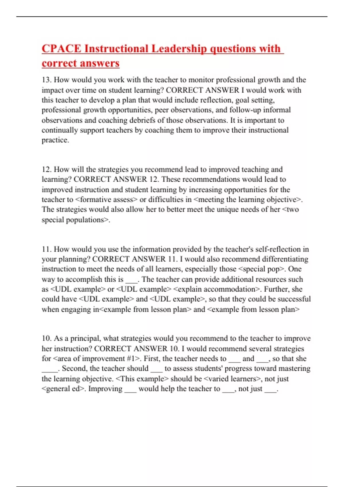 13. How would you work with the teacher to monitor professional growth and the impact over time on student learning? CORRECT ANSWER I would work with this teacher to develop a plan that would include reflection, goal setting, professional growth opportunities, peer observations, and follow-up informal observations and coaching debriefs of those observations. It is important to continually support teachers by coaching them to improve their instructional practice. 12. How will the strategies you recommend lead to improved teaching and learning? CORRECT ANSWER 12. These recommendations would lead to improved instruction and student learning by increasing opportunities for the teacher to <formative assess> or difficulties in <meeting the learning objective>. The strategies would also allow her to better meet the unique needs of her <two special populations>. 11. How would you use the information provided by the teacher's self-reflection in your planning? CORRECT ANSWER 11. I would also recommend differentiating instruction to meet the needs of all learners, especially those <special pop>. One way to accomplish this is ___. The teacher can provide additional resources such as <UDL example> or <UDL example> <explain accommodation>. Further, she could have <UDL example> and <UDL example>, so that they could be successful when engaging in<example from lesson plan> and <example from lesson plan> 10. As a principal, what strategies would you recommend to the teacher to improve her instruction? CORRECT ANSWER 10. I would recommend several strategies for <area of improvement #1>. First, the teacher needs to ___ and ___, so that she ____. Second, the teacher should ___ to assess students' progress toward mastering the learning objective. <This example> should be <varied learners>, not just <general ed>. Improving ___ would help the teacher to ___, not just ___.