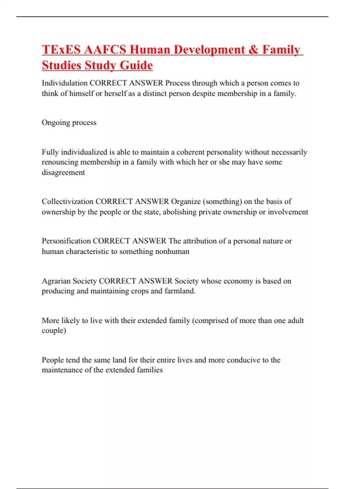 Individulation CORRECT ANSWER Process through which a person comes to think of himself or herself as a distinct person despite membership in a family. Ongoing process Fully individualized is able to maintain a coherent personality without necessarily renouncing membership in a family with which her or she may have some disagreement Collectivization CORRECT ANSWER Organize (something) on the basis of ownership by the people or the state, abolishing private ownership or involvement Personification CORRECT ANSWER The attribution of a personal nature or human characteristic to something nonhuman Agrarian Society CORRECT ANSWER Society whose economy is based on producing and maintaining crops and farmland. More likely to live with their extended family (comprised of more than one adult couple)