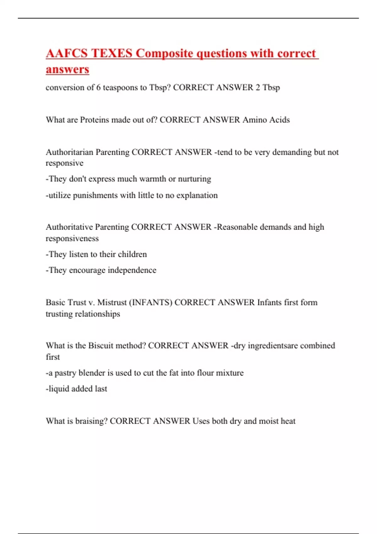 conversion of 6 teaspoons to Tbsp? CORRECT ANSWER 2 Tbsp What are Proteins made out of? CORRECT ANSWER Amino Acids Authoritarian Parenting CORRECT ANSWER -tend to be very demanding but not responsive -They don't express much warmth or nurturing -utilize punishments with little to no explanation Authoritative Parenting CORRECT ANSWER -Reasonable demands and high responsiveness -They listen to their children -They encourage independence Basic Trust v. Mistrust (INFANTS) CORRECT ANSWER Infants first form trusting relationships What is the Biscuit method? CORRECT ANSWER -dry ingredientsare combined first -a pastry blender is used to cut the fat into flour mixture -liquid added last What is braising? CORRECT ANSWER Uses both dry and moist heat