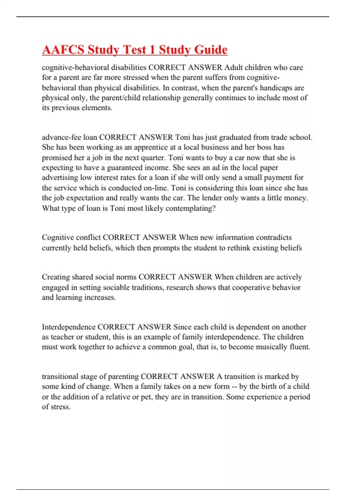 cognitive-behavioral disabilities CORRECT ANSWER Adult children who care for a parent are far more stressed when the parent suffers from cognitive-behavioral than physical disabilities. In contrast, when the parent's handicaps are physical only, the parent/child relationship generally continues to include most of its previous elements. advance-fee loan CORRECT ANSWER Toni has just graduated from trade school. She has been working as an apprentice at a local business and her boss has promised her a job in the next quarter. Toni wants to buy a car now that she is expecting to have a guaranteed income. She sees an ad in the local paper advertising low interest rates for a loan if she will only send a small payment for the service which is conducted on-line. Toni is considering this loan since she has the job expectation and really wants the car. The lender only wants a little money. What type of loan is Toni most likely contemplating? Cognitive conflict CORRECT ANSWER When new information contradicts currently held beliefs, which then prompts the student to rethink existing beliefs Creating shared social norms CORRECT ANSWER When children are actively engaged in setting sociable traditions, research shows that cooperative behavior and learning increases. Interdependence CORRECT ANSWER Since each child is dependent on another as teacher or student, this is an example of family interdependence. The children must work together to achieve a common goal, that is, to become musically fluent. transitional stage of parenting CORR