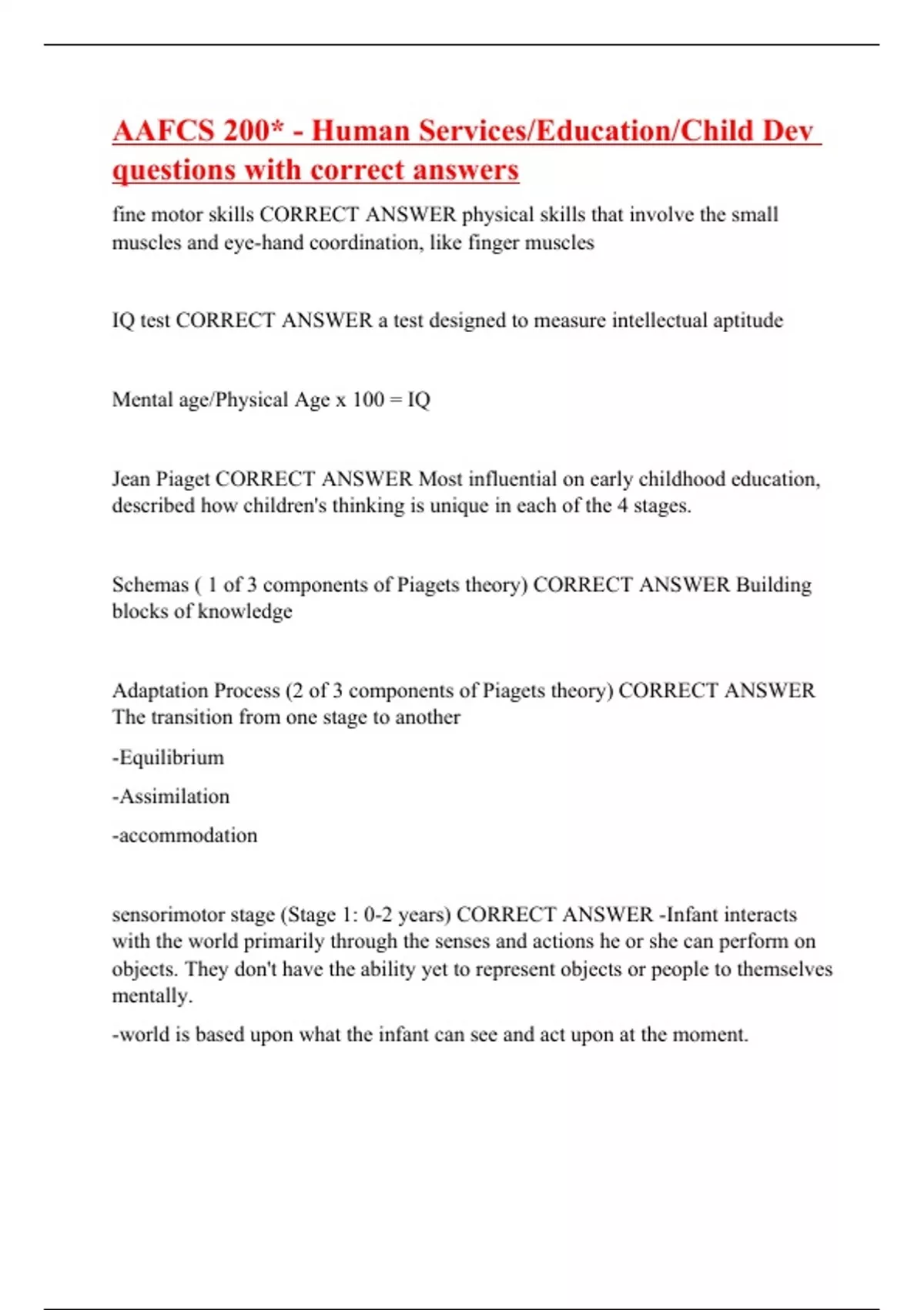 fine motor skills CORRECT ANSWER physical skills that involve the small muscles and eye-hand coordination, like finger muscles IQ test CORRECT ANSWER a test designed to measure intellectual aptitude Mental age/Physical Age x 100 = IQ Jean Piaget CORRECT ANSWER Most influential on early childhood education, described how children's thinking is unique in each of the 4 stages. Schemas ( 1 of 3 components of Piagets theory) CORRECT ANSWER Building blocks of knowledge Adaptation Process (2 of 3 components of Piagets theory) CORRECT ANSWER The transition from one stage to another -Equilibrium -Assimilation -accommodation sensorimotor stage (Stage 1: 0-2 years) CORRECT ANSWER -Infant interacts with the world primarily through the senses and actions he or she can perform on objects. They don't have the ability yet to represent objects or people to themselves mentally. -world is based upon what the infant can see and act upon at the moment.