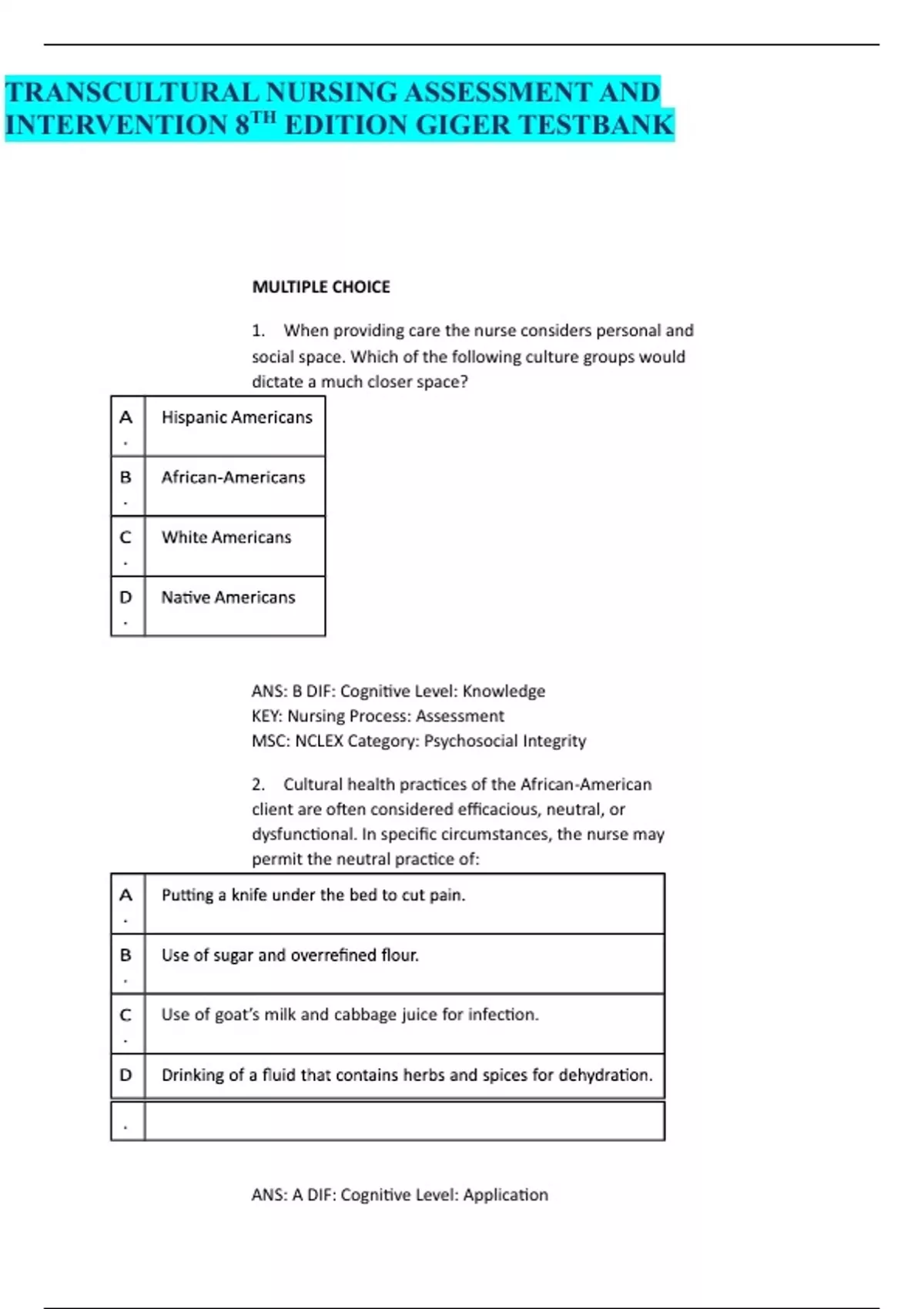 TRANSCULTURAL NURSING ASSESSMENT AND INTERVENTION 8TH EDITION GIGER TESTBANK