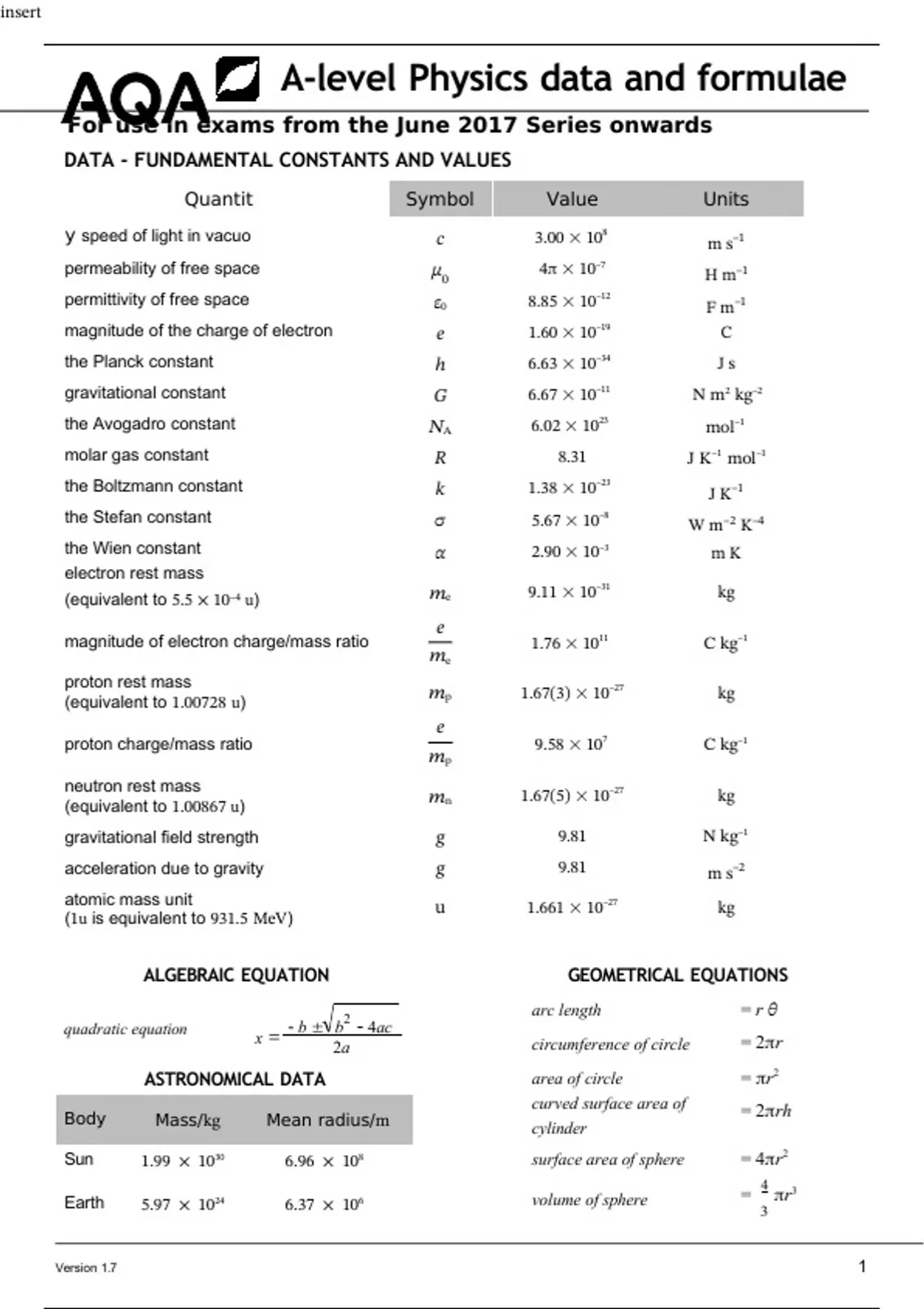 AQA A-level Physics data and formulae- insert paper 2