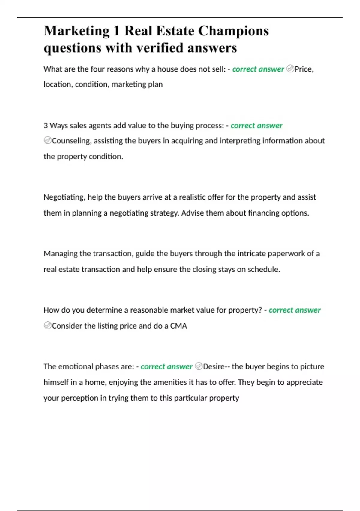 Summary Marketing 1 Real Estate Champions questions with verified answers