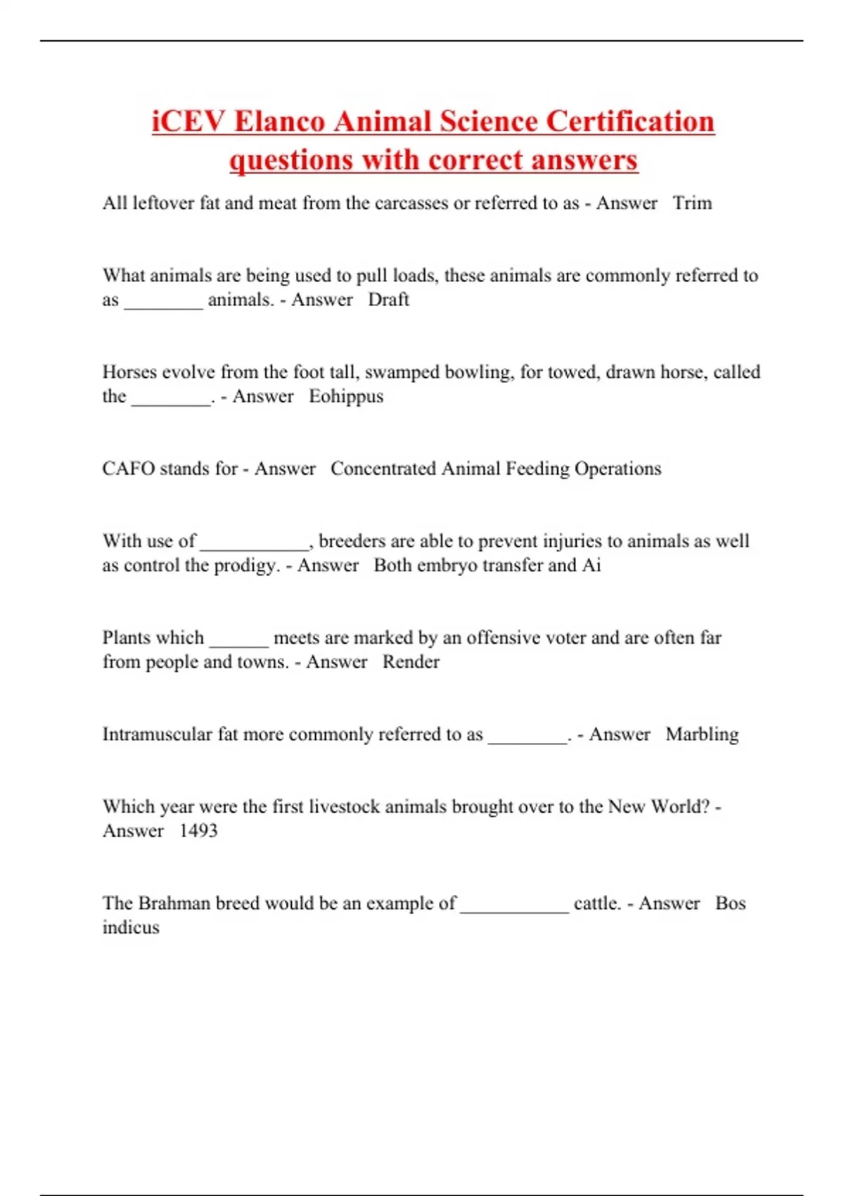 All leftover fat and meat from the carcasses or referred to as - Answer Trim What animals are being used to pull loads, these animals are commonly referred to as ________ animals. - Answer Draft Horses evolve from the foot tall, swamped bowling, for towed, drawn horse, called the ________. - Answer Eohippus CAFO stands for - Answer Concentrated Animal Feeding Operations With use of ___________, breeders are able to prevent injuries to animals as well as control the prodigy. - Answer Both embryo transfer and Ai Plants which ______ meets are marked by an offensive voter and are often far from people and towns. - Answer Render Intramuscular fat more commonly referred to as ________. - Answer Marbling Which year were the first livestock animals brought over to the New World? - Answer 1493 The Brahman breed would be an example of ___________ cattle. - Answer Bos indicus