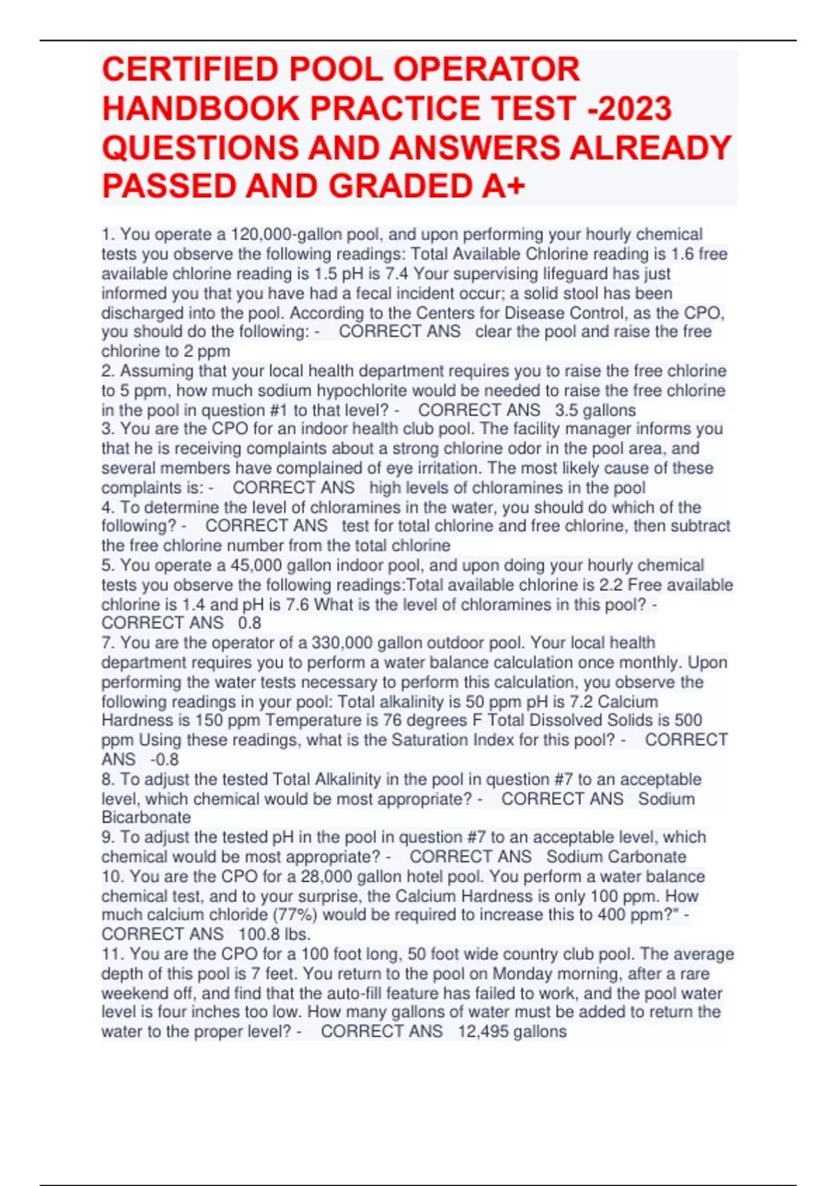 1. You operate a 120,000-gallon pool, and upon performing your hourly chemical tests you observe the following readings: Total Available Chlorine reading is 1.6 free available chlorine reading is 1.5 pH is 7.4 Your supervising lifeguard has just informed you that you have had a fecal incident occur; a solid stool has been discharged into the pool. According to the Centers for Disease Control, as the CPO, you should do the following: - CORRECT ANS clear the pool and raise the free chlorine to 2 ppm 2. Assuming that your local health department requires you to raise the free chlorine to 5 ppm, how much sodium hypochlorite would be needed to raise the free chlorine in the pool in question #1 to that level? - CORRECT ANS 3.5 gallons 3. You are the CPO for an indoor health club pool. The facility manager informs you that he is receiving complaints about a strong chlorine odor in the pool area, and several members have complained of eye irritation. The most likely cause of these complaints is: - CORRECT ANS high levels of chloramines in the pool 4. To determine the level of chloramines in the water, you should do which of the following? - CORRECT ANS test for total chlorine and free chlorine, then subtract the free chlorine number from the total chlorine 5. You operate a 45,000 gallon indoor pool, and upon doing your hourly chemical tests you observe the following readings:Total available chlorine is 2.2 Free available chlorine is 1.4 and pH is 7.6 What is the level of chloramines in this pool? - CORRECT ANS 0.8 7. You are the operator of a 330,000 gallon outdoor pool. Your local health department requires you to perform a water balance calculation once monthly. Upon performing the water tests necessary to perform this calculation, you observe the following readings in your pool: Total alkalinity is 50 ppm pH is 7.2 Calcium Hardness is 150 ppm Temperature is 76 degrees F Total Dissolved Solids is 500 ppm Using these readings, what is the Saturation Index for this pool? - CORRECT ANS -0.8 8. To adjust the tested Total Alkalinity in the pool in question #7 to an acceptable level, which chemical would be most appropriate? - CORRECT ANS Sodium Bicarbonate 9. To adjust the tested pH in the pool in question #7 to an acceptable level, which chemical would be most appropriate? - CORRECT ANS Sodium Carbonate 10. You are the CPO for a 28,000 gallon hotel pool. You perform a water balance chemical test, and to your surprise, the Calcium Hardness is only 100 ppm. How much calcium chloride (77%) would be required to increase this to 400 ppm?" - CORRECT ANS 100.8 lbs. 11. You are the CPO for a 100 foot long, 50 foot wide country club pool. The average depth of this pool is 7 feet. You return to the pool on Monday morning, after a rare weekend off, and find that the auto-fill feature has failed to work, and the pool water level is four inches too low. How many gallons of water must be added to return the water to the proper level? - CORRECT ANS 1