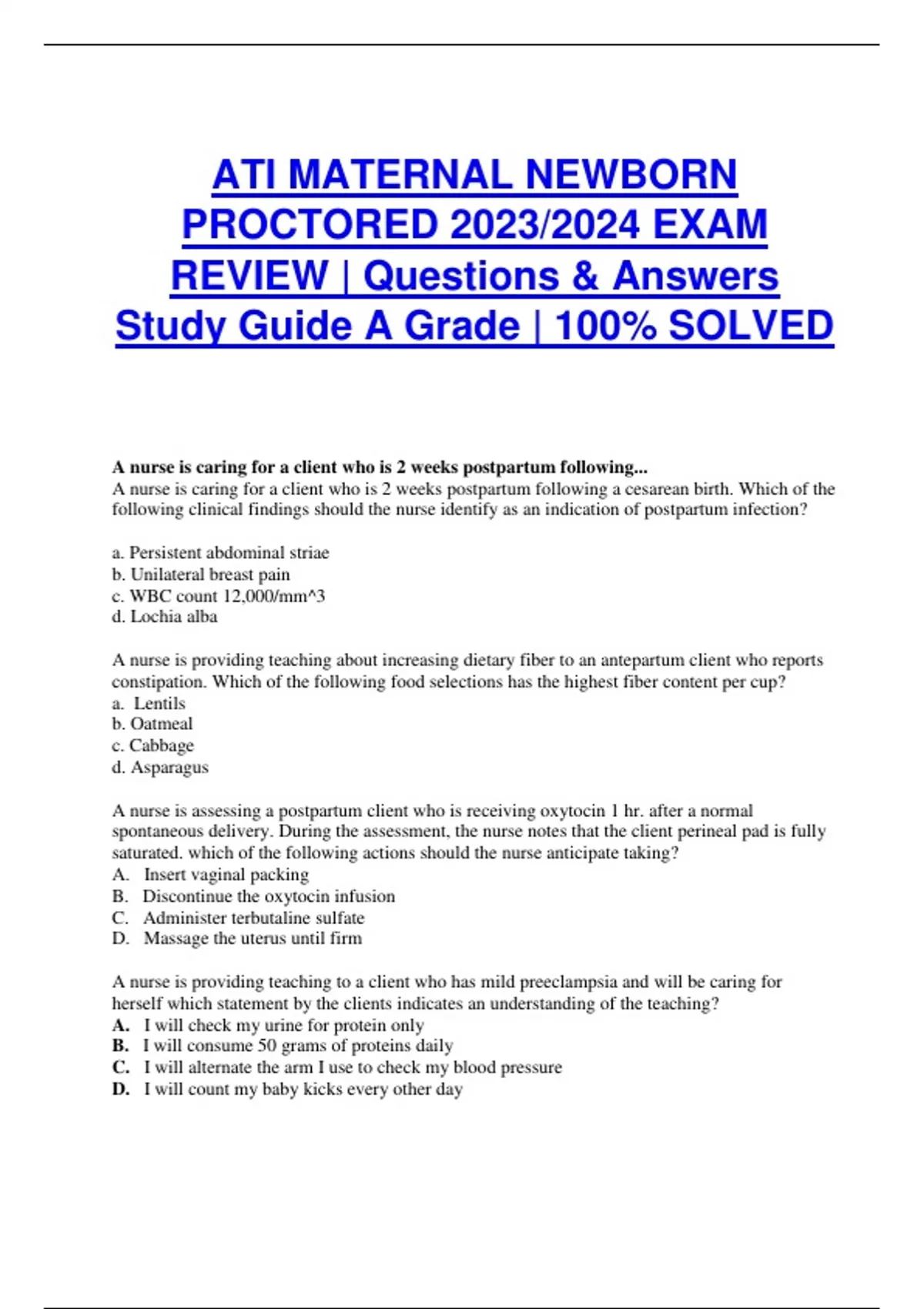 ATI MATERNAL NEWBORN PROCTORED 2023/2024 EXAM REVIEW | Questions & Answers Study Guide A Grade | 100% SOLVED A nurse is caring for a client who is 2 weeks postpartum following... A nurse is caring for a client who is 2 weeks postpartum following a cesarean birth. Which of the following clinical findings should the nurse identify as an indication of postpartum infection? a. Persistent abdominal striae b. Unilateral breast pain c. WBC count 12,000/mm^3 d. Lochia alba A nurse is providing teaching about increasing dietary fiber to an antepartum client who reports constipation. Which of the following food selections has the highest fiber content per cup? a. Lentils b. Oatmeal c. Cabbage d. Asparagus A nurse is assessing a postpartum client who is receiving oxytocin 1 hr. after a normal spontaneous delivery. During the assessment, the nurse notes that the client perineal pad is fully saturated. which of the following actions should the nurse anticipate taking? A. Insert vaginal packing B. Discontinue the oxytocin infusion C. Administer terbutaline sulfate D. Massage the uterus until firm A nurse is providing teaching to a client who has mild preeclampsia and will be caring for herself which statement by the clients indicates an understanding of the teaching? A. I will check my urine for protein only B. I will consume 50 grams of proteins daily C. I will alternate the arm I use to check my blood pressure D. I will count my baby kicks every other day A nurse is assessing a client and observes the umbilical cord protruding from the vaginal , after calling A. Administer oxygen via nonrebreather facemask B. Wrap the cord with a sterile towel saturated in normal saline C. Place a rolled towel under the clients right hip. D. Apply upward pressure against the presenting part. A nurse is reviewing the laboratory results of a client who is at 20 weeks of gestation and has type 1 diabetes mellitus. Which of the following report to the provider? A. Hct 34% B. Platelets 170,000/mm^3 C. BUN 25 mg/dL D. HbA1c 6% A nurse on the labor and delivery unit is assessing four clients. Which of the following clients is a candidate for an induction of labour A. A client who has gestational diabetes mellitus B. A client who has placenta plavia C. A client who has active genital herpes D. A client who has a previous uterine incision. A nurse is providing discharge instructions to a client who is breastfeeding her newborn. Which of the following A. Allow the baby to feed at least every 3 hr. B. Offer the new born 30ml (1 oz.) of water between feeding C. Feed the newborn 5 to 10 min per breast D. Expect two to four wet diapers every 24 hrs A nurse is caring for a client who is at 8 weeks of gestation and has an ectopic pregnancy. A. Bright, red vaginal discharge B. Scaphoid abdomen C. Elevated blood pressure D. Sharp pelvic pain A nurse is providing education about RH(D) immune globulin to a client who is pregnant. What indicate for administering RH(D)immune globulin? A. The client delivers an Rh-negative newborn B. The client has a history of placenta previa C. The client had a spontaneous abortion D. The client is at 16 weeks of gestation. A nurse is providing teaching to a client who is 2 days postpartum. A. You should store your diaphragm in sterile water after each use B. You should use an oil based vaginal lubricant when inserting your diaphragm C. You should have your provider refit you for a new diaphragm D. You should keep the diaphragm in place for at least 4 hours after intercourse. A nurse is caring for a client who is 12hr. postpartum and has a fourth degree laceration of the perineum A. Apply a moist , warm compress to the perineum B. Apply provide iodine to the client perineum after the voids C. Provide the client with a cool sitz bath D. Administer methyfergenevine 0.2 mg A nurse is assessing four newborns. Which of the following clinical findings... A. A 2 day old infant who is excreting a thin, white discharge from both nipples B. A 2 day old infant who has a respiratory rate of 70/mims C. A 16 hr old infant who has a blood glucose level of 50 mg/dl D. A 16 hr old infant who has yet to pass a meconium stool A nurse is performing an initial assessment of a new born who was delivered with a nuchal cord. A. Telanglectatic nevi B. Facial petechiae C. Erythema toxicum D. Periauricular papilloma A nurse is assisting the provider to administer a dinoprostone insert to induce labor A. Verify that the informed consent is obtained prior to administration B. Place the client in a semi fowler position for 1 hr. after administration. C. Instruct the client to avoid urinary elimination until after administration D. Allow the mediation to reach room temp. prior to administration. A nurse is caring for a client who is at 20 weeks of gestation and has trichomoniasis. Which of the following findings should the nurse expected? A. malodorous B. Urinary frequency C. vulva lesions D. Thick, white vaginal discharge. 32. Calculation A nurse is teaching a group of women who are pregnant about actions to take if they are suspect they are experiencing preterm labor the nurse provides. A. call your doctor if you have contractions every 20 minutes for at least 1 hour B. expect to have a small amount of fluid leaking from the vagina c. empty your bladder d. lie on your back for 2 hrs. A nurse is admitting a client to the birthing unit who reports her contraction started 1hrs. ago. The nurse determine realizes that the client is at risk for which of the following conditions. A. Hyperremesis gravidarum B. Ectopic pregnancy C. Incompetent cervix D. postpartum hemorrhage. A nurse is providing teaching to a postpartum client who has a prescription for a rubella immunization. Which of the A. I should avoid breastfeeding for 2 weeks following the immunization B. I will receive a series of three immunization and each one will be a month apart c. I should avoid becoming pregnant for at least 1 month following the immunization d. I will repor