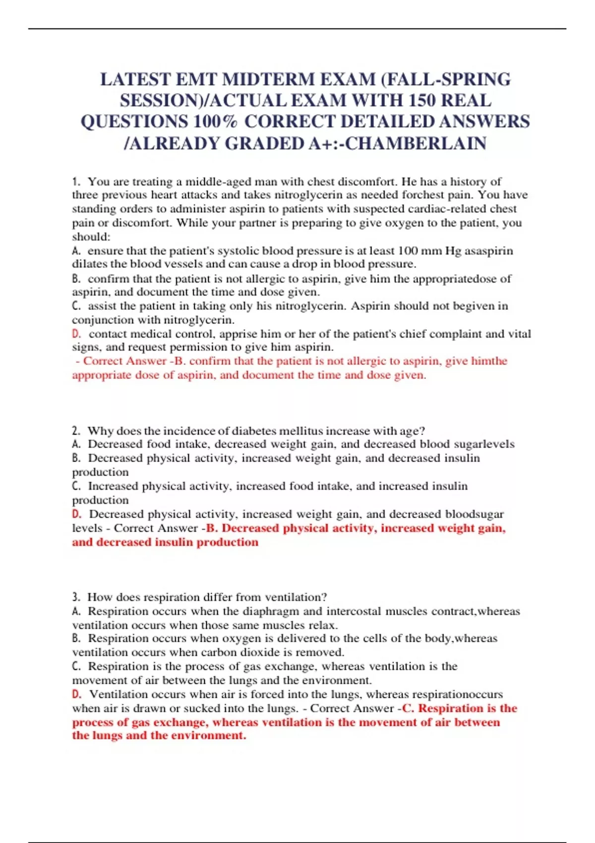 LATEST 2023/224 EMT MIDTERM EXAM (FALL-SPRING SESSION)/ACTUAL EXAM WITH 150 REAL QUESTIONS 100% CORRECT DETAILED ANSWERS /ALREADY GRADED A+:-CHAMBERLAIN